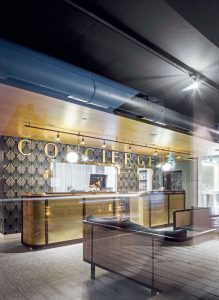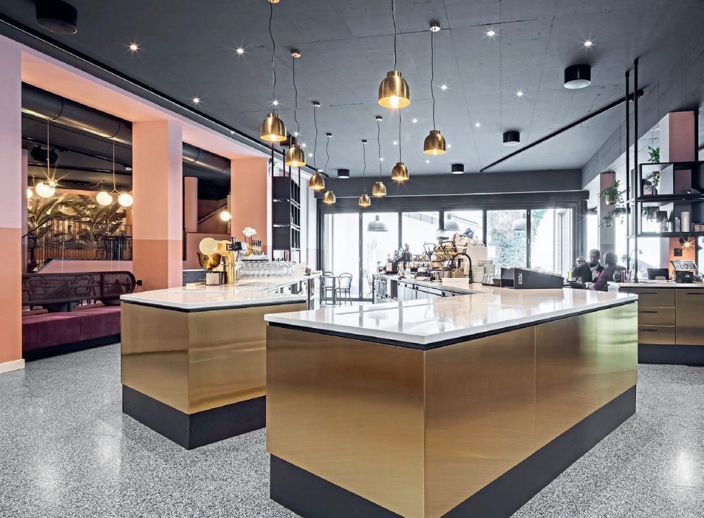 Waren die öffentlichen Bereiche zuvor auf einen überschaubaren Empfangsbereich mit Bar beschränkt, bietet das heutige Hotel im Erdgeschoss ein großes „Wohnzimmer“ mit umfassendem gastronomischem Angebot – in einem Umfeld, das gestalterisch graziler und offener, jedoch nicht weniger einheitlich erscheint als die Lobby. Frühstückssalon, Kaffeehaus, Bar, Eventbereich und das hoteleigene Restaurant gehen fließend ineinander über. Und weil alle Bereiche allen Gästen wie auch externen Besuchern offenstehen, präsentiert sich der Raum den ganzen Tag über als angenehm lebhafter Kommunikationsbereich – wenn nicht gerade Lockdown ist.