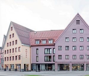 Eine Rolle spielte aber auch, dass die Architekten bewusst auf das Umfeld Bezug nehmen wollten. Allein deshalb planten sie keine exaltierte bauliche Landmarke, sondern ergänzten das aus drei Teilen zusammengesetzte Hotel schlicht um zwei weitere Bauteile und eine neue Tiefgarage. Ergebnis ist ein selbstverständlich wirkender Neubau, der sich mit feinem Besenstrichputz, steilem Ziegeldach und maßstäblichen Fensterformaten bestens in das Altstadtgefüge einpasst. Für mehr Eigenständigkeit sorgt die mit dem Umfeld harmonierende und doch hervorstechende weinrote Fassadenfarbe, die zusammen mit dem Sockel aus rotem Sandstein und den hochwertigen Kupferverblechungen eine gewisse Noblesse erzeugt.