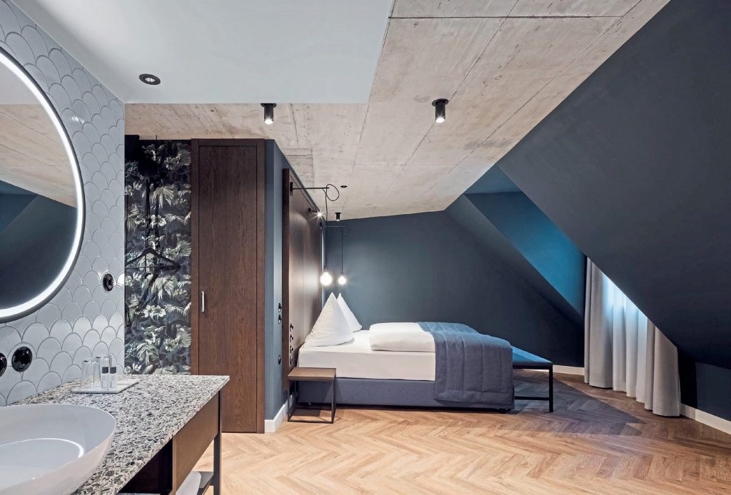 Ansonsten bieten die zwischen 30 und 40 Quadratmeter großen Zimmer das angenehm kontrastreiche Nebeneinander einer sorgfältig gestalteten Inneneinrichtung und roh belassener Sichtbetondecken. Und während sich die Räume an der Nordseite zur Stadt orientieren, sind aus den Südzimmern die spätgotische Burganlage und die Allgäuer Alpen zu sehen.