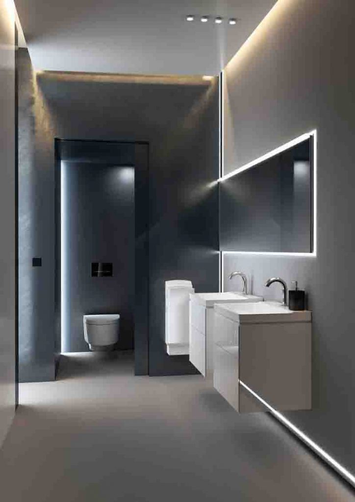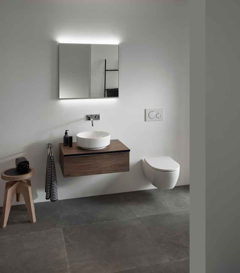 Am Waschplatz sind berührungslose Armaturen mit elektronischer Nutzererkennung besonders gut geeignet, wie zum Beispiel die Waschtischarmaturen Geberit Brenta und Piave. Sie sind als Wand- oder Standarmaturen erhältlich und präsentieren sich elegant in schlankem, zeitlosem Design. Zu mehr Hygiene und Sauberkeit tragen ebenfalls die Badkeramiken bei. Die Geberit VariForm Waschtische – egal ob rund, eckig, oval oder elliptisch, als Aufsatz-, Einbau- oder Unterbau-Variante – sind besonders reinigungsfreundlich. Optional sind sie mit der Spezialglasur KeraTect erhältlich, die der Keramik eine nahezu porenfreie, extrem glatte Oberfläche verleiht und so die Reinigung deutlich erleichtert. Passend für die Aufsatz-Waschtische gibt es von VariForm auch Badmöbel in unterschiedlichen Ausführungen. Für noch mehr Gestaltungsfreiheit lassen sich diese auch mit dem modularen Möbelkonzept der Komplettbadserie Geberit iCon kombinieren. So ist die Badausstattung in Design und Funktion perfekt aufeinander abgestimmt.