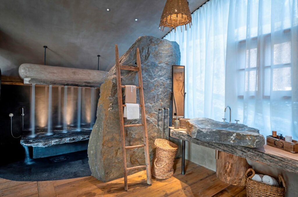 Den Naturstein nach den eigenen Vorstellungen zu verbauen, war schwieriger als gedacht. Die großen Waschbecken sollten aus riesigen Blöcken herausgeschliffen werden. Da war viel Tüftelei vonnöten, bis die jetzigen Unikate in ihrer schroffen Schönheit entstanden. Wie die Duschwände aus Felsgestein bringen sie die Region im wahrsten Sinne des Wortes „hautnah“ an den Gast heran.