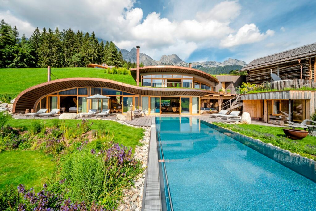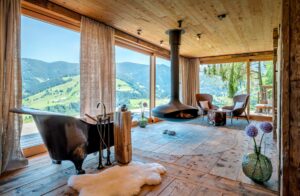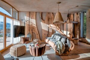Die in das Geäst des eigenen Waldes gebaute Wilderer Villa auf drei Ebenen vermittelt mit ihren riesigen runden Fenstern eine Art luxuriöses Hobbitfeeling. Auch hier haben Renate und Huwi Oberlader mit dem schwenkbaren Kamin, einer freistehenden Kupferwanne, viel Altholz und Naturstein einen luxuriösen und sehr behaglichen Rückzugsort geschaffen, mit einem Hot Tub auf der Dachterrasse.