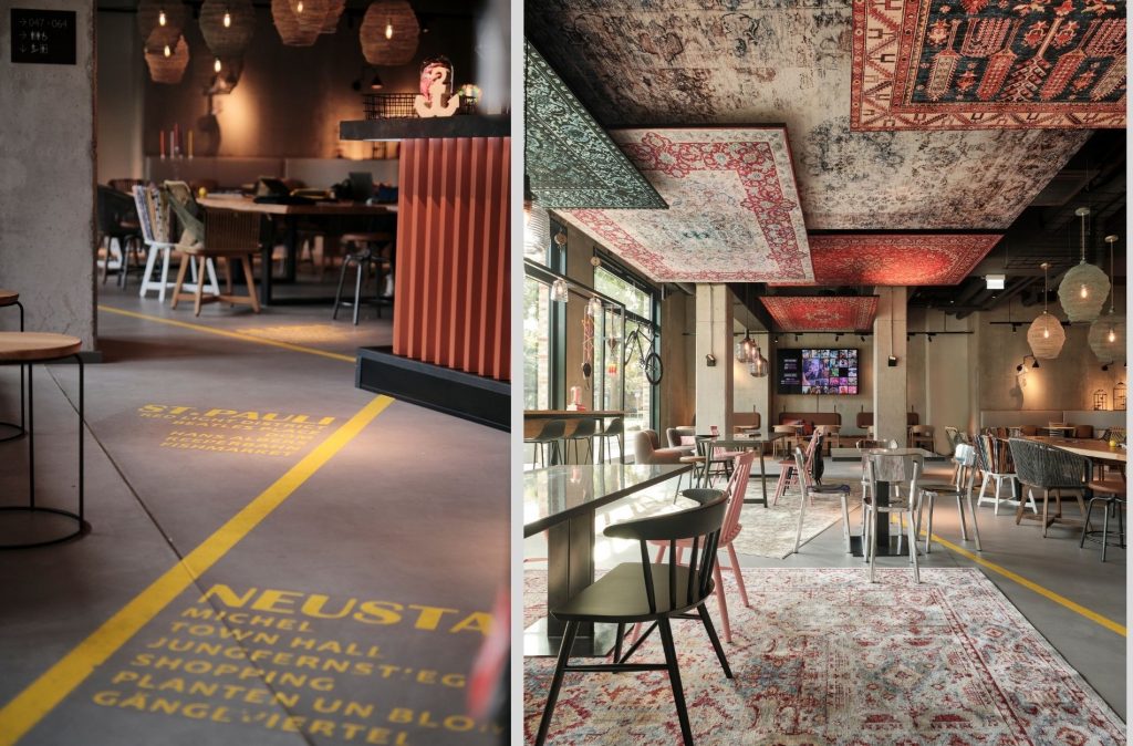 Die Bar, die gleichzeitig die Rezeption bildet, ist ein Container und erstrahlt mit indirektem Licht und rostfarbener Verkleidung. Ein Blickfang im Community-Bereich bilden die dort installierten ‚fliegenden Teppiche‘. Sie sollen an das rege Treiben in der Speicherstadt erinnern – traditioneller Dreh- und Angelpunkt des europäischen Teppichhandels