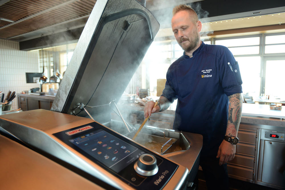 Für Rohländer-Franke, der seit 26 Jahren als Koch arbeitet und unter anderem Referenzen wie das Park Hilton in München, die Schweizer Stuben in Wertheim, den Nassauer Hof in Wiesbaden sowie das Roomers, das Steigenberger Airport Hotel und Sander Gourmet in Frankfurt aufweist, ist die Auseinandersetzung mit moderner und digital gesteuerter Küchentechnik selbstverständlich. „Der iVario war komplett neu für mich, aber ich bin von seiner Vielseitigkeit fasziniert. Man kann mit diesem Gerät wirklich zaubern, zum Beispiel vorne braten, in der Mitte warm halten und hinten bleibt es auf Wunsch kalt,“ schwärmt er. Ergänzt wird der iVario Pro im b’mine durch zwei Rational Combi-Dämpfer der Reihe iCombi Pro, die über das gleiche Bedienkonzept wie der iVario verfügen. Sie sind in der hinter der Show-Küche gelegenen Vorbereitungs-Küche untergebracht.