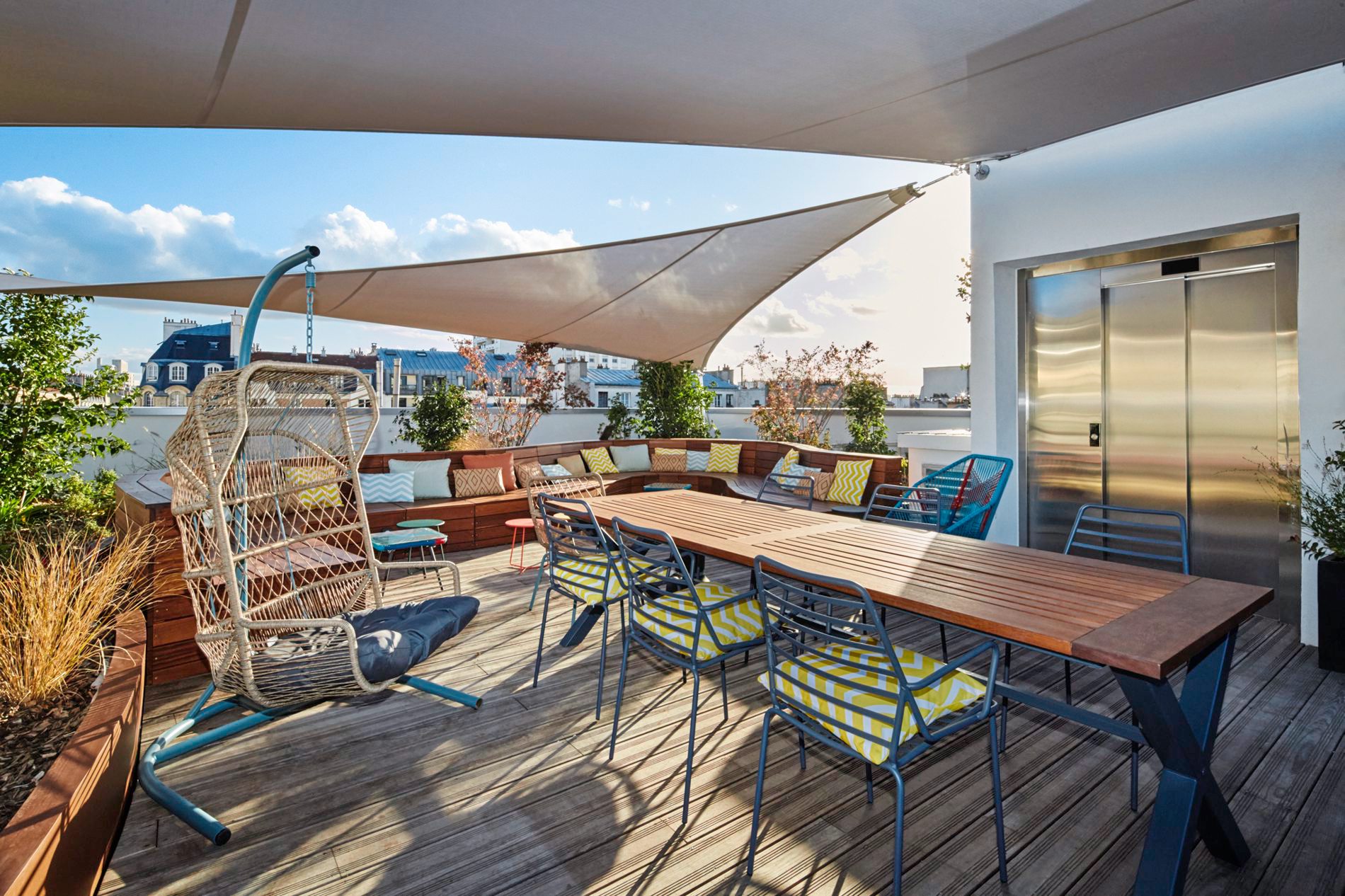 Die 100 Quadratmeter große Dachterrasse im Jo & Joe Paris Nation heißt tagsüber wie auch nachts Reisende und Pariser willkommen. © Abaca Press, Thierry Sauvage