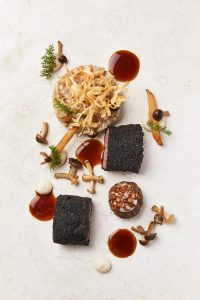 Harmonische Komposition: Maike Menzel serviert gern raffiniert zubereitete alte Getreidesorten, wie hier den Emmer, zusammen mit niederbayerischem Lamm, Schwarzwurzel und Buchenpilzen. © Hotel Vier Jahreszeiten Kempinski München