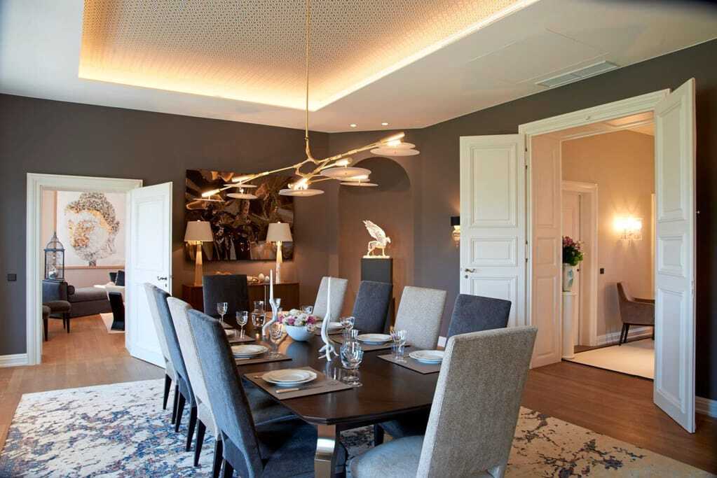 Die Royal Residence am Schloss Nymphenburg liegt am Schnittpunkt von Stadt und Land und ist das exklusivste Domizil in München. Auf drei Etagen mit insgesamt 836 Quadratmetern verteilt, verfügt die Royal Residence über vier Schlafzimmer, sieben Bäder, drei Wohnzimmer, Esszimmer, Küche, Fitnessraum, Tagungsraum, Heimkino und Weinkeller. Im Außenbereich umfasst die Royal Residence einen privaten Garten mit einer Majolika-Terrasse, die bis zu 100 Gäste empfängt.