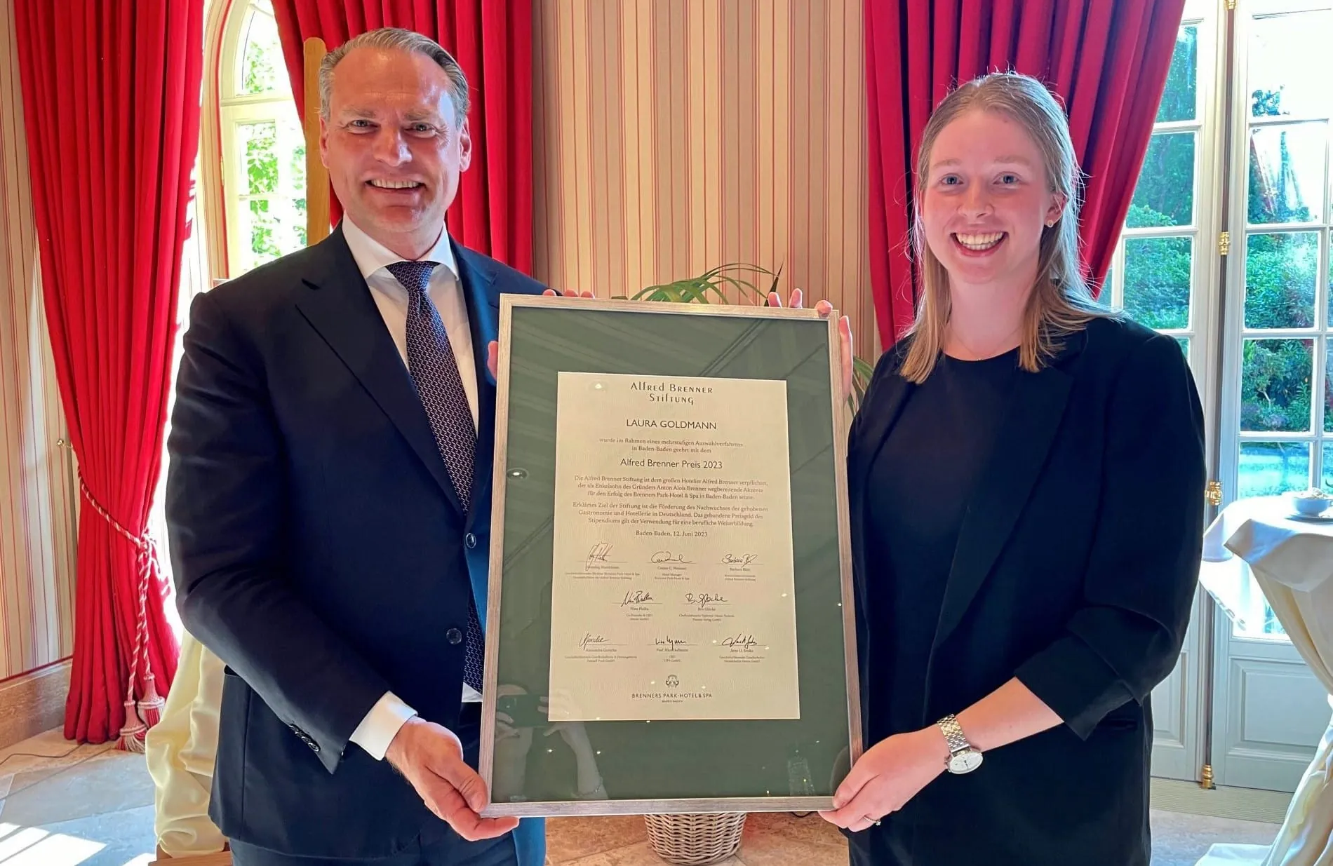 Gespannte Stille vor der Enthüllung der Siegerurkunde in der Orangerie von Brenners Park-Hotel & Spa in Baden-Baden: Gewinnerin des 19. Alfred Brenner Stipendiums ist Laura Goldmann, HR & Training Executive im Althoff Grandhotel Schloss Bensberg. Die 23-Jährige überzeugte die Jury mit ihrer Zielstrebigkeit und Hands-on-Mentalität, ihrer Passion für Human Resources und ihrem umfangreichen sozialen Engagement. „Ich habe die zwei Tage, die wir hier alle erleben durften, als unheimliche Bereicherung gesehen, ebenso das Netzwerken und die Möglichkeit, wertvolle Kontakte zu knüpfen“, so Goldmann in ihren Dankesworten.