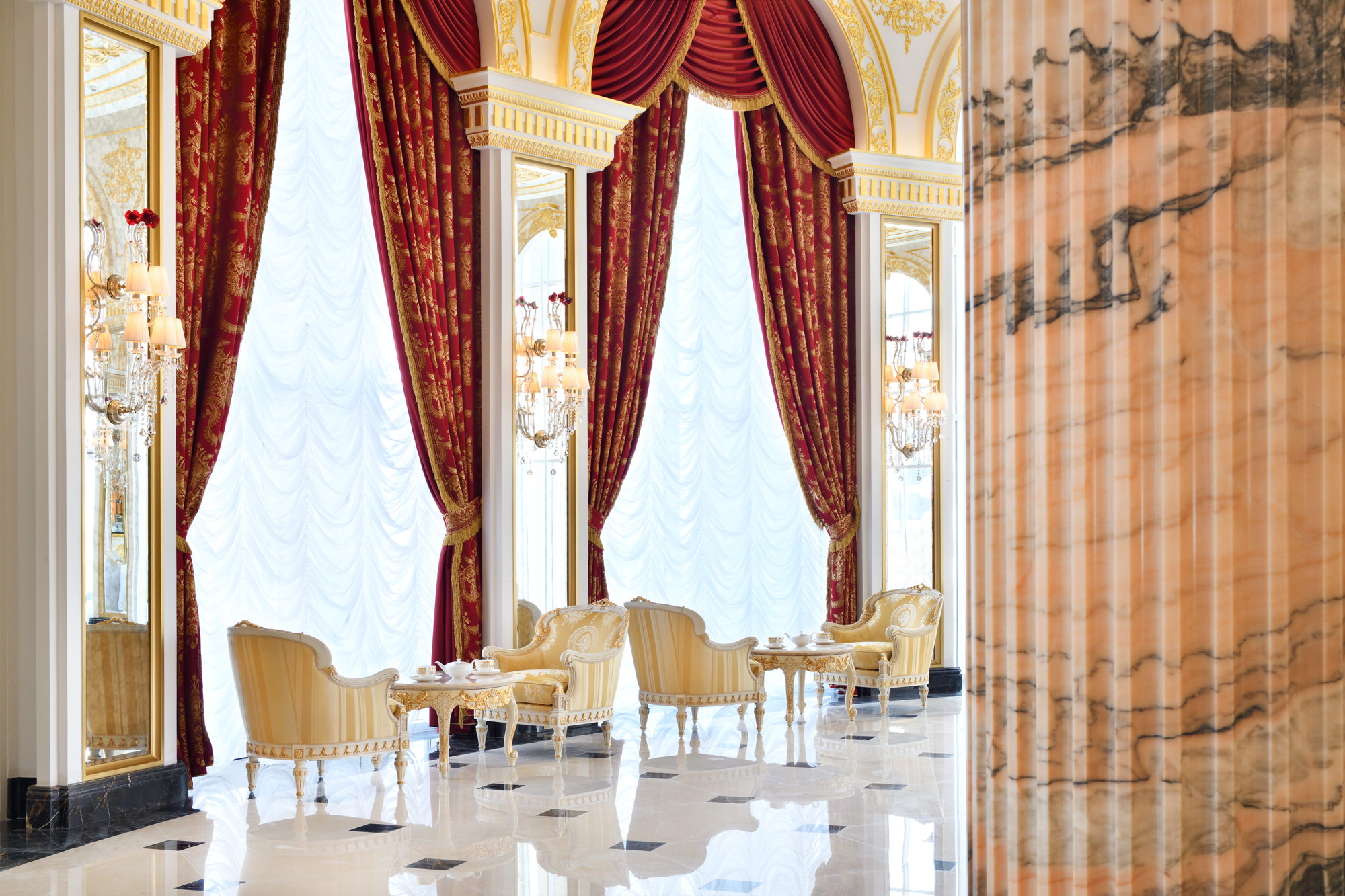 Inspiriert durch die glorreichen europäischen Paläste der Vergangenheit ist das Emerald Palace Kempinski Dubai der neoklassizistischen Architektur nachempfunden und symmetrisch designt. Die Opulenz des Hotels spiegelt sich sowohl in den 6.400 Kronleuchtern als auch in den zahlreichen, handgearbeiteten Designelementen wider. Besonders der Kronleuchter aus 40.000 Swarovski Kristallen im Atrium und die handgemalten Motive aus 24-karätigem Gold imponieren.