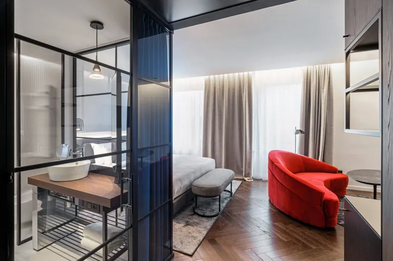 Die 159 Zimmer und Suiten des Hotels wurden vom Studio Marco Piva als kleine urbane Lofts entworfen mit großen Fenstern sowie Glasinnenwänden. Maßgefertigte Möbel, die Kombination von warmen, natürlichen Materialien wie Holz und Leder mit Glas und Metall sowie die Farbpalette aus Braun, Schwarz und dunklem Marineblau sollen eine Atmosphäre schaffen, die den charakteristischen Stil Mailands widerspiegelt.