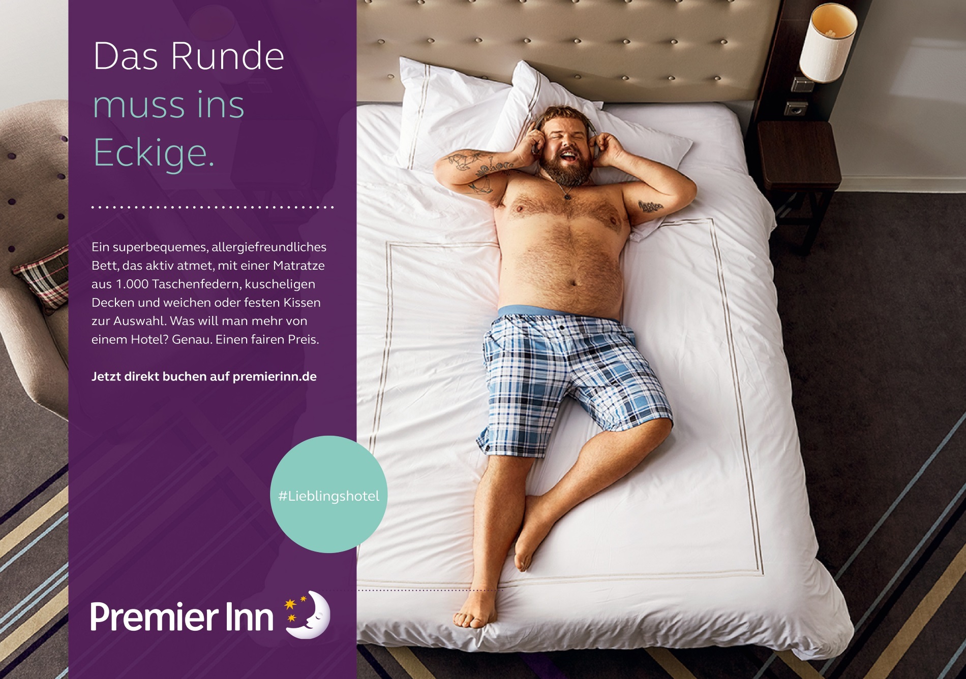 Das erste Kampagnenmotiv mit dem aufmerksamkeitsstarken Titel ‚Das Runde muss ins Eckige‘ zeigt einen Hotelgast, der es sich im Bett gemütlich macht. Mit der Beschreibung der positiven Attribute des komfortablen Betts und der abschließenden Frage „Was will man mehr von einem Hotel? Genau. Einen fairen Preis.“ wird die Kernbotschaft in den Vordergrund gehoben. Ein Call-to-Action auf die Website ist neben der Neugierde weckenden Headline und dem informativen Textkörper der dritte Baustein des Motivs. Denn auf der eigenen Website garantiert die Hotelmarke stets den besten Zimmerpreis und verzichtet auf einen Vertrieb über Online Travel Agencies. Begleitet werden alle Kampagnen mit dem Hashtag #Lieblingshotel.