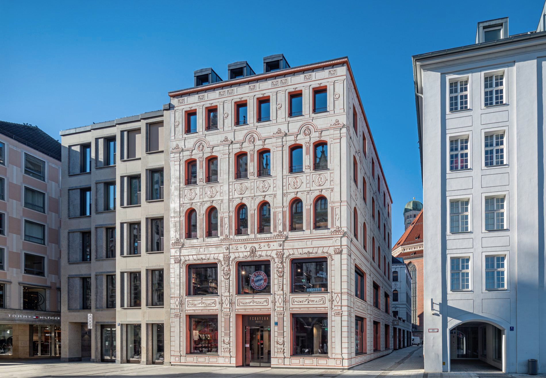 Drei Gründe sorgen dafür, dass der Neubau, in dem sich das DO & CO Hotel befindet, auf keinen Fall zu verfehlen ist. Erstens liegt er im Herzen von München genau zwischen Frauenkirche und Rathaus – zentraler geht es nicht. Zweitens zeigt seine Fassade ein auffälliges mehrfarbiges Putzrelief mit dem Bild eines einst hier stehenden mondänen Altbaus. Der Entwurf für dieses Sgraffito stammt – ebenso wie das Gebäude selbst – aus der Feder des Münchener Architekturbüros Hild und K. Den dritten Grund liefert schließlich die sogenannte FC Bayern World, die in dem zum Rathaus orientierten Gebäudeteil untergebracht ist. Sie gilt mit 3.500 Quadratmetern Verkaufsfläche als größter Fanshop des Fußball-Rekordmeisters und präsentiert sich extrovertiert mit großflächigen Schaufenstern zur Fußgängerzone.