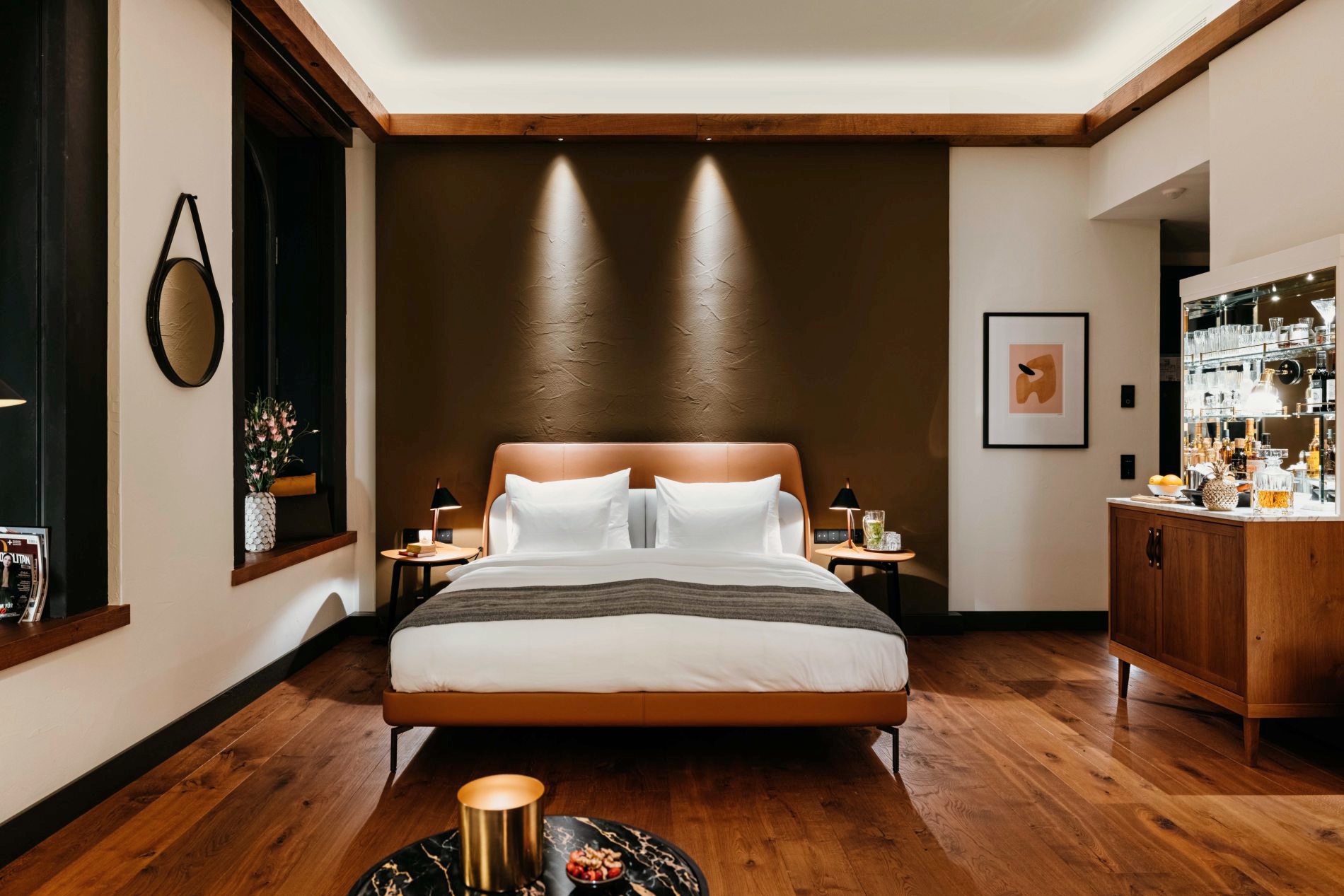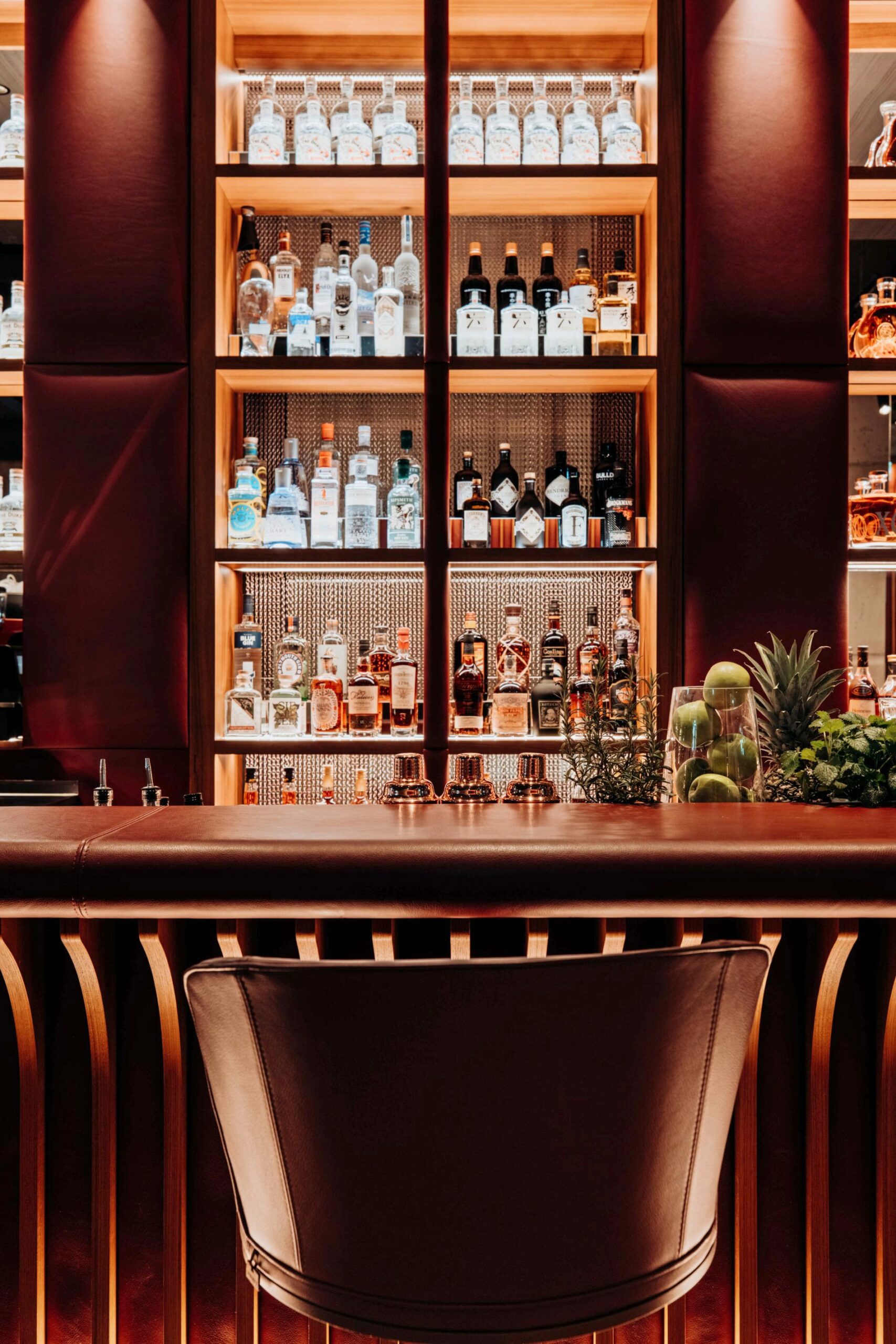 Was in allen Zimmern und Suiten die vielleicht größte Aufmerksamkeit erregt, ist die Bar. Die Rede ist hier nicht von einer mehr oder weniger verschämt untergebrachten Minibar, sondern von einer offenen Wein- & Cocktailbar mit Marmortischplatte und Spiegelrückwand. Kleine Flaschen mit Obstbränden und verschiedenen Gin-Sorten zählen ebenso zum Inventar wie eine Auswahl an Whiskys, Cognacs und Rotweinen. Gekühlte Champagner, Weißweine und nichtalkoholische Getränke sowie Eiswürfel sind direkt darunter in einem Kühlschrank zu finden. Dass es sich bei dieser Bar nicht nur um Deko handelt, zeigt nicht zuletzt ein Blick auf die Preisliste: Mittlere zweistellige Beträge werden nach Öffnen der Flaschen mindestens fällig.