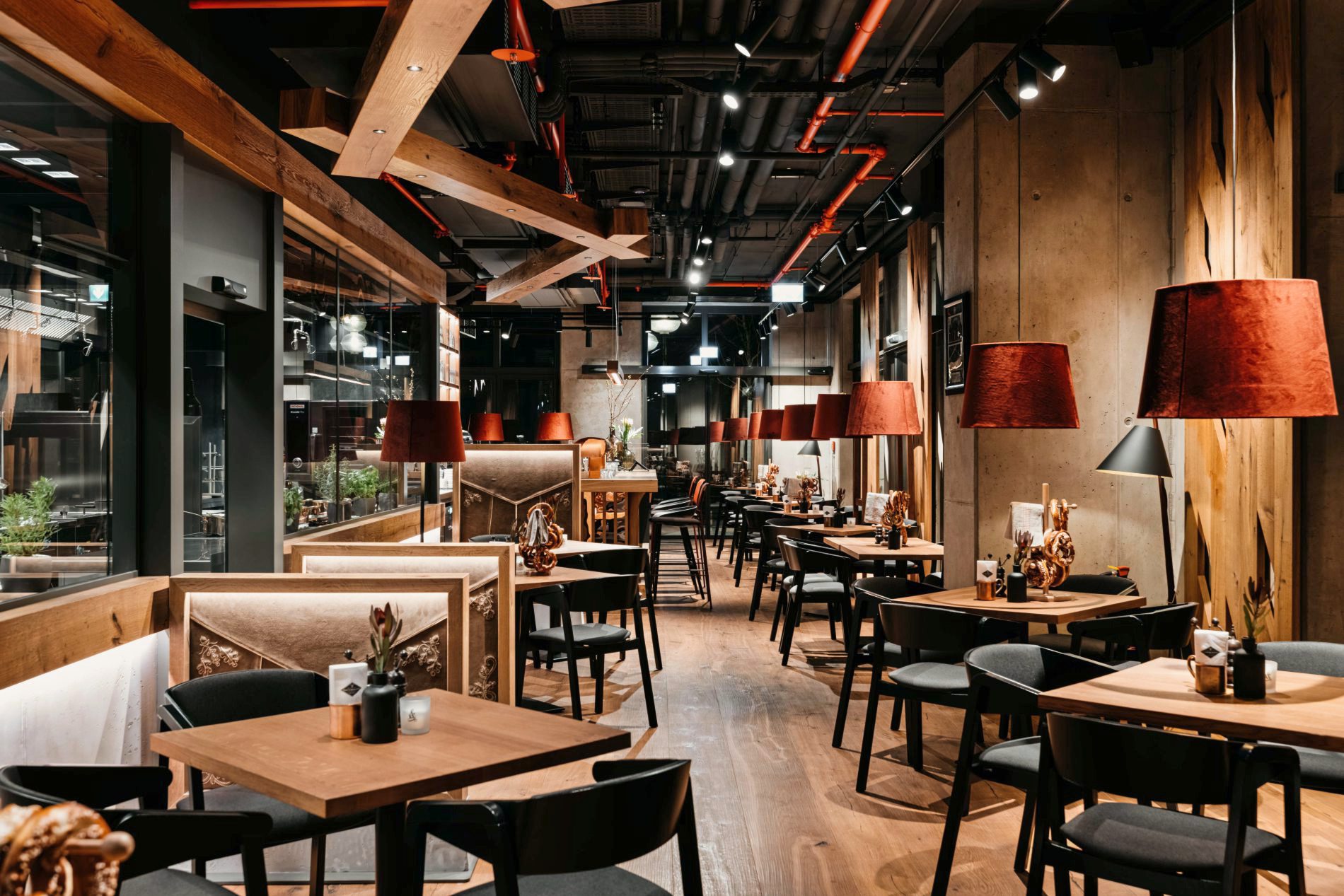 Im Gegensatz zum lauten Licht- und Farbspektakel der FC Bayern World ist das neue DO & CO Hotel von einer vornehmen Zurückhaltung geprägt. Anstelle großer Lettern, Leuchtreklamen oder Transparente verweist lediglich ein kleines Schild mit der Aufschrift "DO & CO" auf den Haupteingang in den Arkaden entlang der Filserbräugasse. Doch selbst wer dann genau unter dem Schild des bekannten österreichischen Catering-Unternehmens steht, nimmt zunächst nicht das Hotel, sondern vor allem die hoteleigene Gastronomie wahr, die im Erdgeschoss unter dem unprätentiösen Namen "Gastwirtschaft" firmiert. Beim Blick durch die mit Falttüren großflächig öffenbaren Glasflächen zeigt sich ein Lokal mit bodenständig-moderner Gestaltung und heimischer Küche. Beides trägt dazu bei, zwischen dem bunten Altstadttreiben und der gehobenen Understatement-Welt des Hotels zu vermitteln.