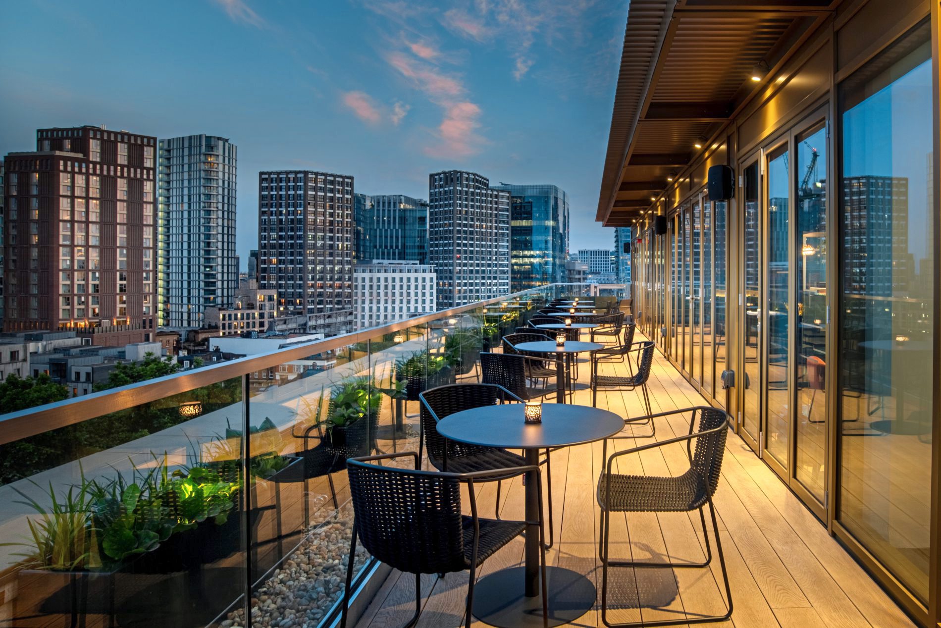 - Pocketsquare-Skyline-Bar und Terrasse mit Cocktail- und Getränkekarte sowie direktem Blick auf die berühmte Skyline Londons.