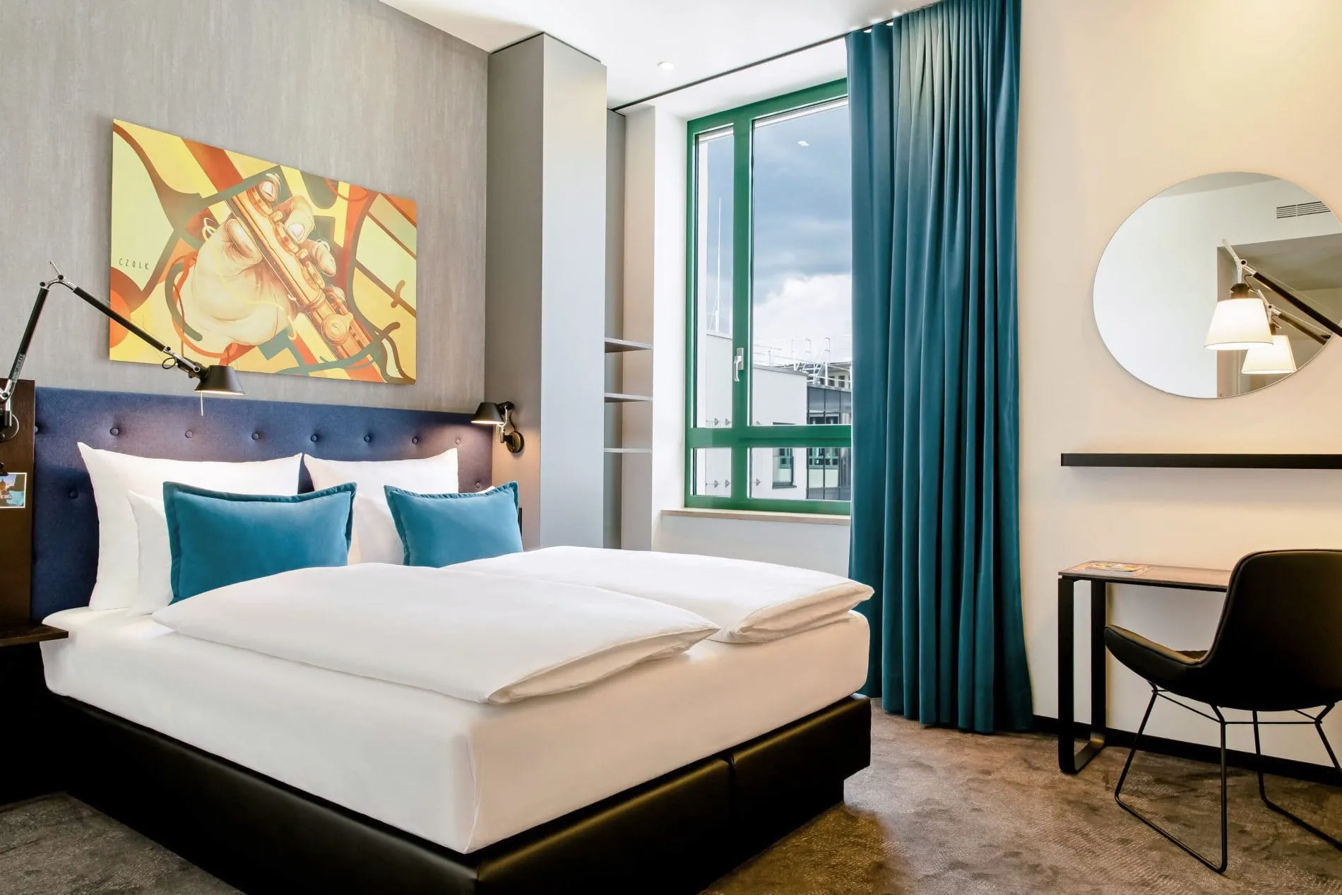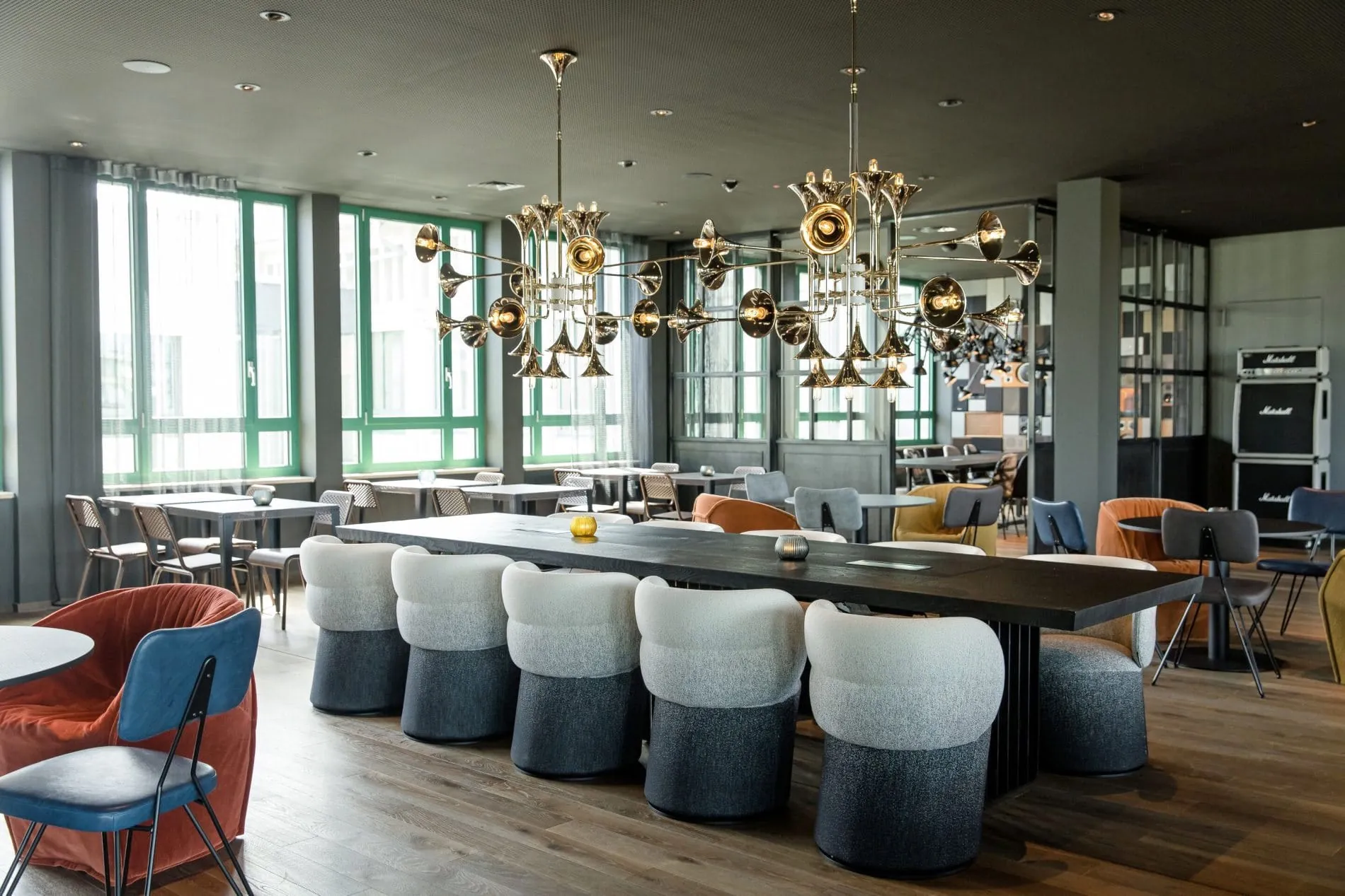 Im daran anschließenden Frühstücks- und Workbereich werden Tische aus Stein und Metall von Sitzgelegenheiten aus unterschiedlichen Materialien und farblichen Akzenten eingerahmt. Eine Wand in der Lounge macht auf die Street Art-Szene Mannheims aufmerksam. Zu sehen ist ein Werk des Künstlers CZOLK, ein freier Illustrator und Graffitikünstler aus Mannheim. Seine Kunstwerke hängen auch in den 340 Zimmern. sar