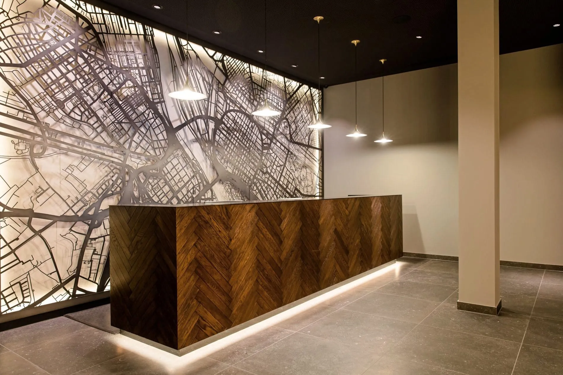 Hinter der Rezeption befindet sich ein aus Schwarzstahl gelaserter Stadtplan, während der hell beleuchtete Hintergrund die vielen Quadrate des Stadtbilds zum Vorschein bringt. Mannheims Innenstadt wurde in Form eines Gitters angelegt, wodurch sie auch den Namen der "Quadratestadt" erhielt. Auch das Muster des Tresens soll an die Ecken und Kanten der Innenstadt erinnern.