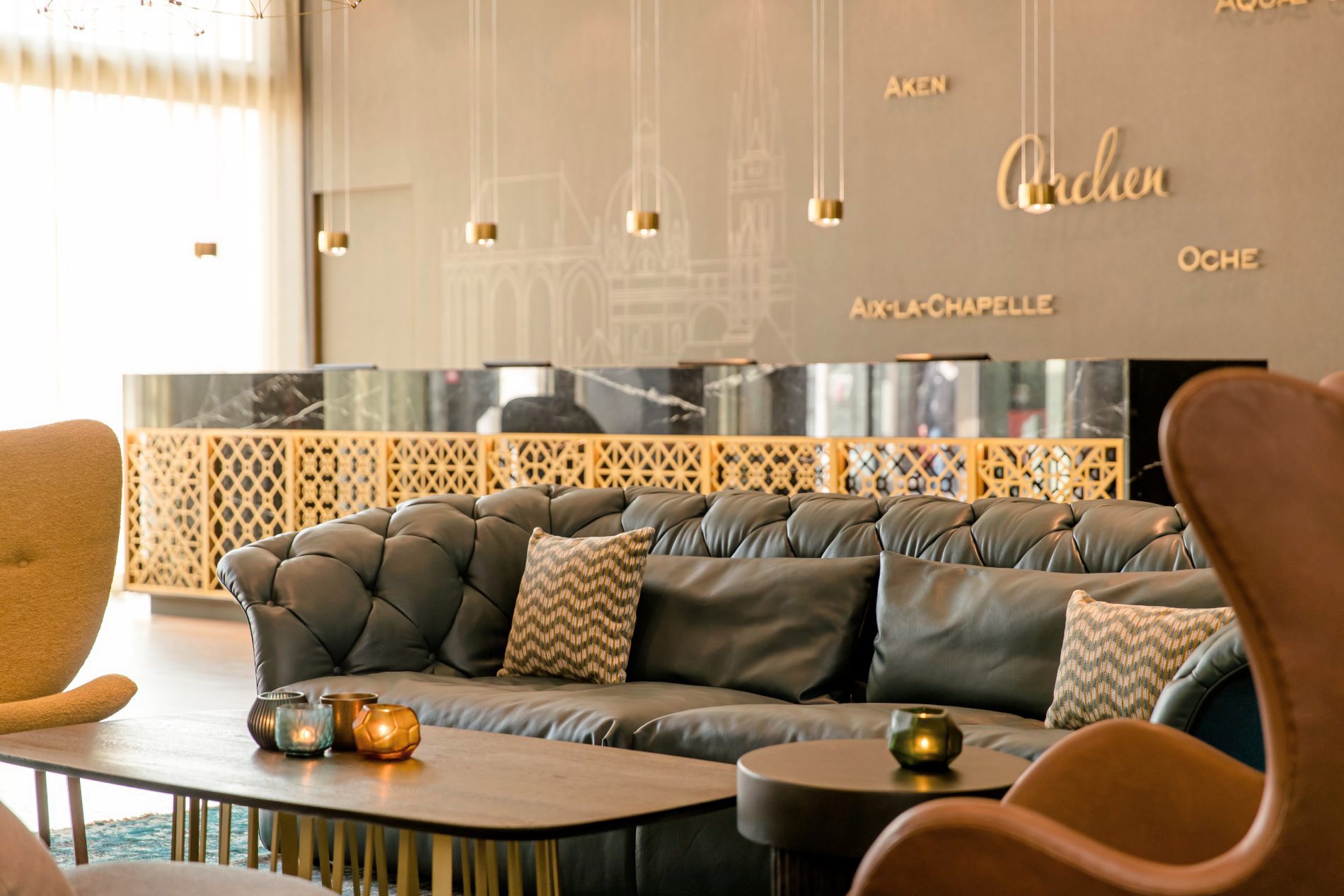 Im Eingangsbereich des Hotels soll der Blick auf den Rezeptionstresen fallen, der aus schwarzem Marmor mit goldenen Ornamentgittern ergänzt wurde. Diese hinterleuchteten Strukturen sind von den Geländern der Pfalzkapelle des Aachener Doms inspiriert. An der Rückwand entdeckt der Gast den Domumriss und das nahegelegene Dreiländereck in Form von goldenen Schriftzügen, die mit den unterschiedlichen Namen Aachens spielen. Neben Ledersofas von Moroso und Leuchten von Quasar und Tom Dixon verfügt die One Lounge über Coworking Spaces und einen abtrennbaren Meetingraum mit Platz für bis zu acht Leute.