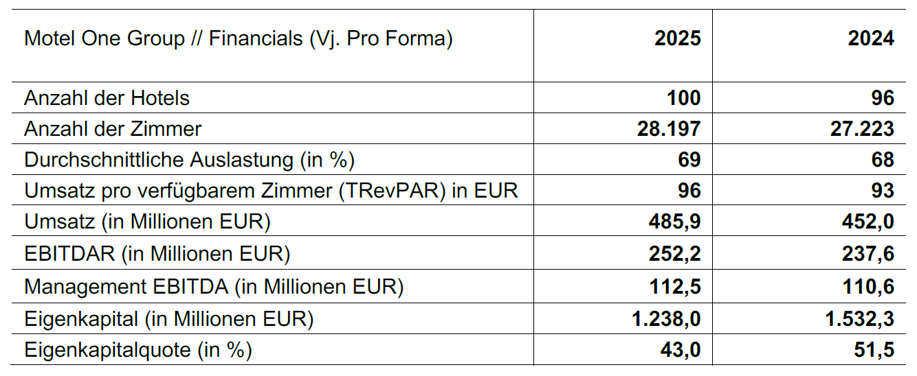 Die Auslastung lag stabil bei 69 Prozent (Vorjahr: 68 Prozent), der Umsatz pro verfügbarem Zimmer (TRevPAR) verbesserte sich auf 96 Euro (Vorjahr 93 Euro). Das Management Ebitda stieg auf 113 Millionen Euro (Vorjahr: 111 Millionen Euro) und lag damit über dem Vorjahresniveau. „Unsere Marke beweist Attraktivität auch ohne Großereignisse – das ist ein echter Belastungstest, den wir bestanden haben“, kommentiert Stefan Lenze, Co-CEO der Motel One Group.
