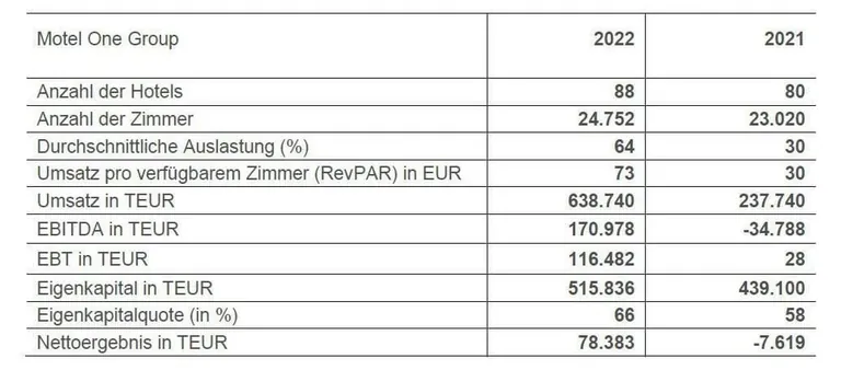 Die Zahlen im Überblick: Die Motel-One-Bilanz 2022 im Vergleich zu 2021 - © Motel One Group