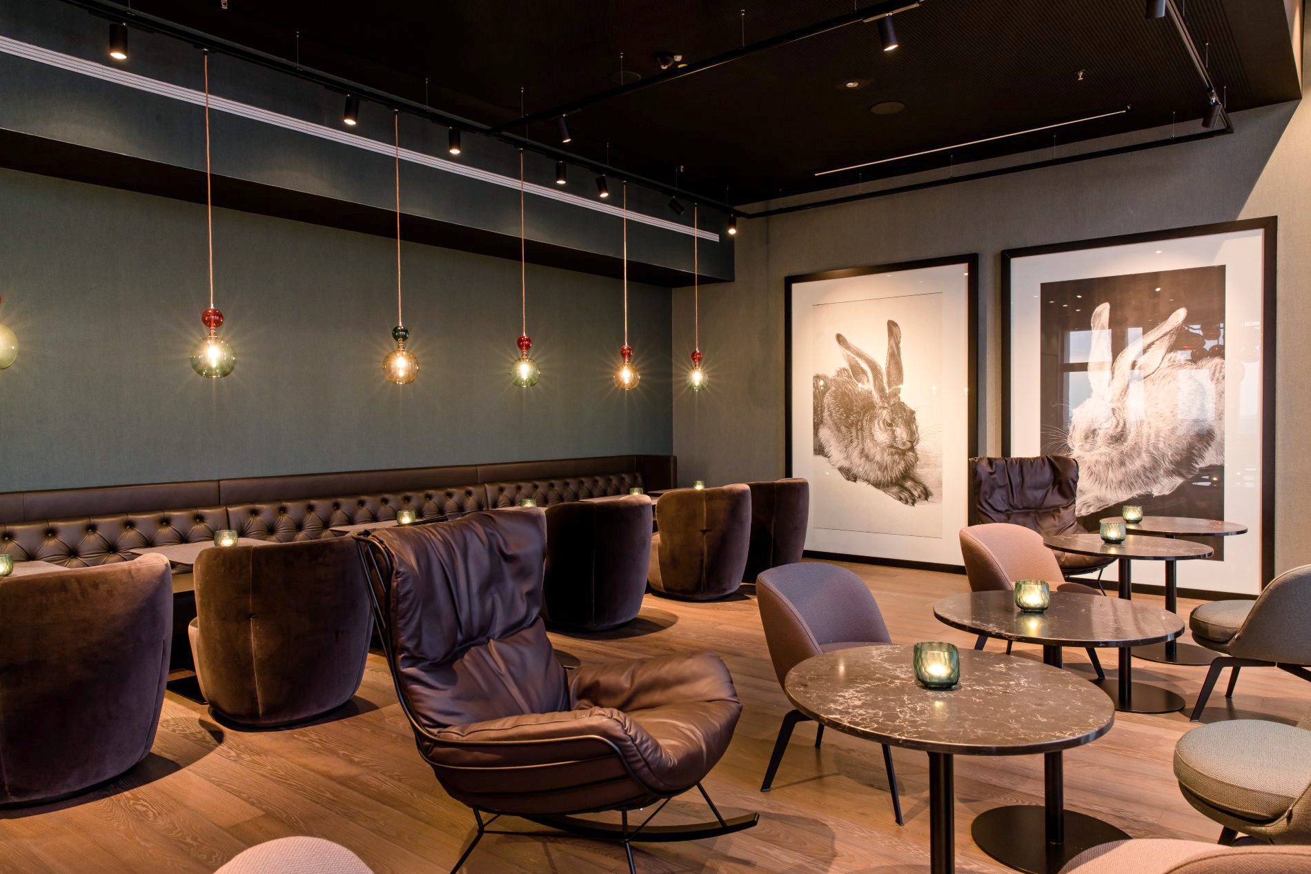 Ein weiteres Highlight erwartet Hotelgäste wie Besucher mit der "Cloud One Bar". Diese bietet in der 14. Etage eine überdachte Loggia und eine begrünte Terrasse mit Blick über die Stadt. An der Rückwand der Bar fallen weitere Dürer-Details ins Auge. Hier leuchtet zum Beispiel die Sternenkarte des alten Meisters über der Skyline von Nürnberg. Kupferleuchten von Quasar sollen für das passende Ambiente sorgen.