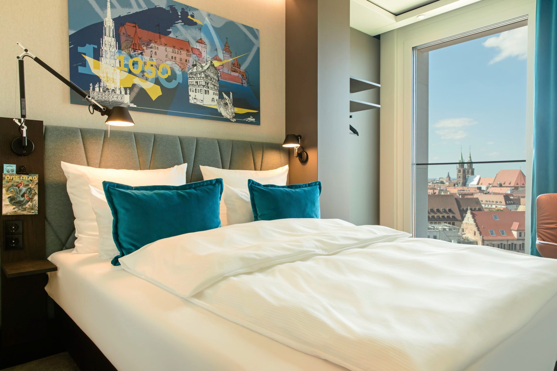Bereits von außen ist das vor kurzem eröffnete Motel One Nürnberg-Hauptbahnhof ein Hingucker: Die Umgestaltung der ehemaligen Hauptpost wurde vom Nürnberger Architekturbüro Max Dudler übernommen und soll einen attraktiven Übergang des Hauptbahnhof-Vorplatzes Richtung Innenstadt erzeugen. Im Inneren des Hotels werden Neuankömmlinge von einem ersten Design-Highlight begrüßt: Die Wandfläche von knapp zwölf Metern gestaltete der Nürnberger Künstler Julian Vogel, der in seinem Kunstwerk Elemente aus seiner Heimatstadt wie auch von Albrecht Dürer aufgegriffen hat. Das war nach Hotelangaben auch das Ziel beim Design des neuen Motel One: Alte Meister erlebbar machen und zeitgenössischen Künstlern einen Raum geben. "So weisen die verwendeten Materialien, aber auch Farbgestaltung und Formgebung des Interieurs immer wieder Verbindungen zu Albrecht Dürers Werken auf", erklärt Ursula Schelle Müller, CMO Motel One.