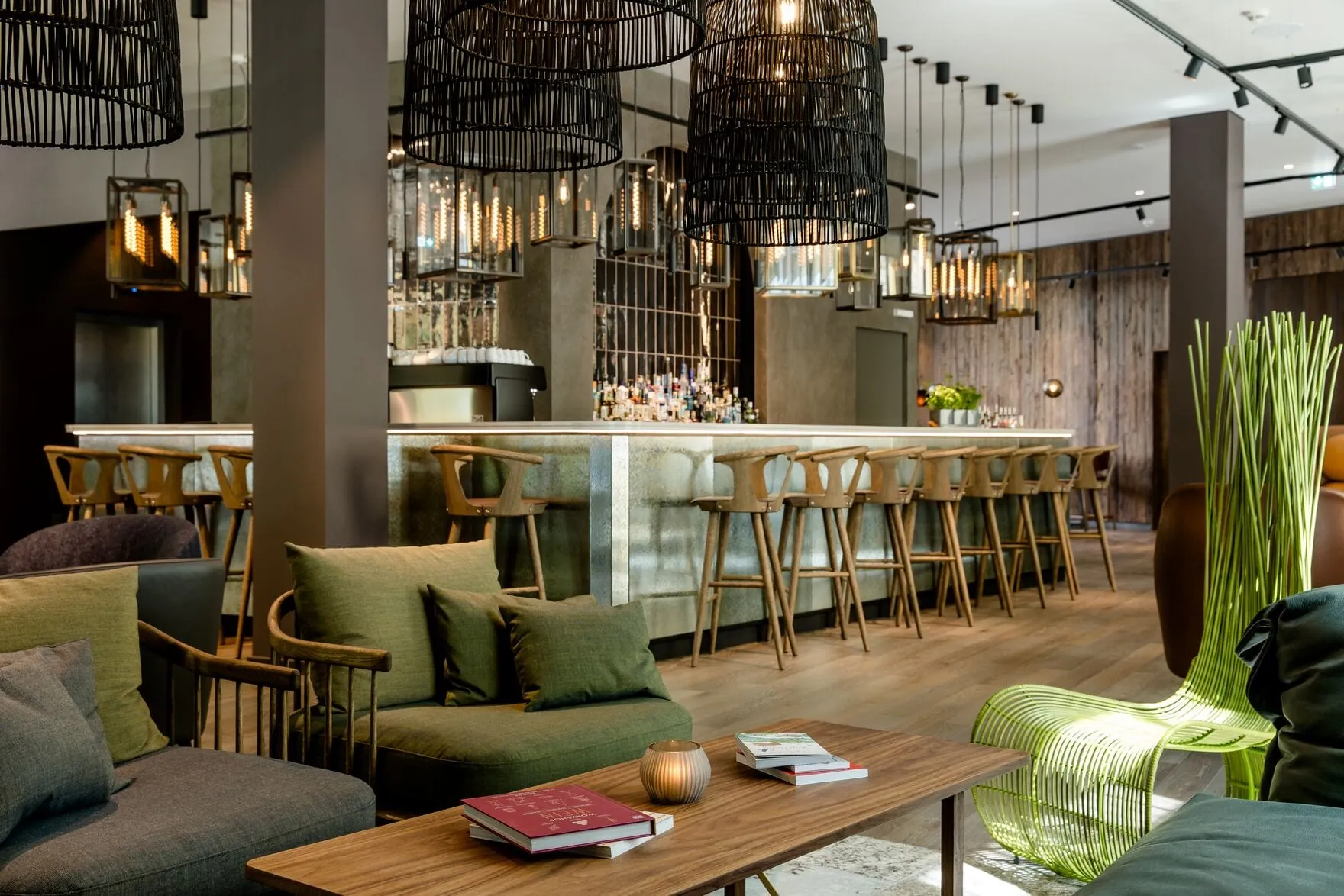Die Lounge und Bar sind dem Weinanbau in Franken gewidmet sowie der alten Mainbrücke als sozialer Treffpunkt des Weingenusses und Austauschs. Gedecktere Farben und Formen der Möbel sowie Holz nehmen den Gast dabei mit in die traditionellen Weinstuben. Die Rückwand der Bar zitiert mit ihrer Betonoptik und den Bögen die Mainbrücke. Die Wände zieren die typische Flaschenform des fränkischen Bocksbeutels. Eine Bilderwand von Stefan Bausewein zeigt Fotos von fränkischen Weingütern, von welchen eine Auswahl fränkischer Weine an der Bar auch direkt zu verkosten ist.