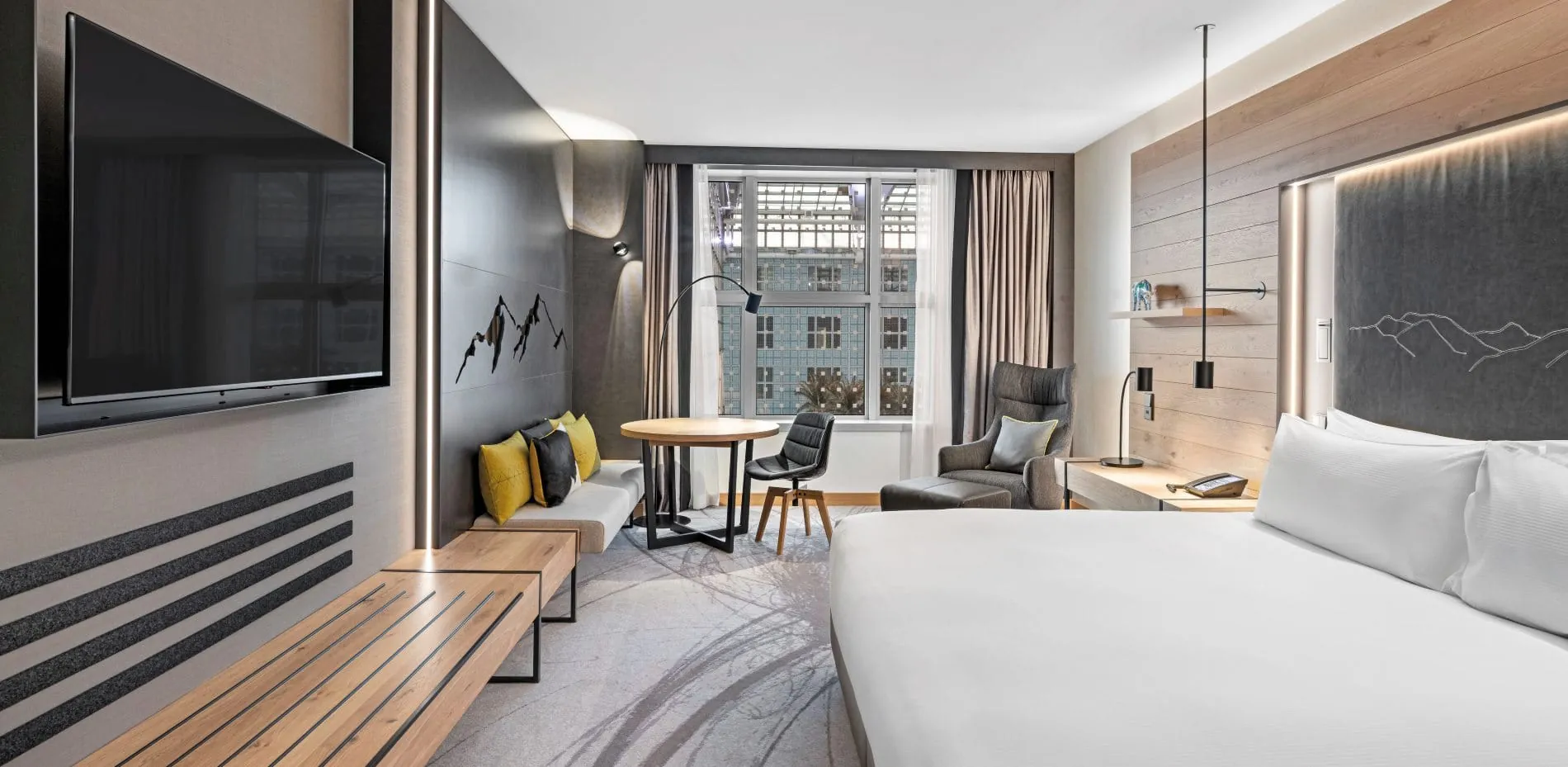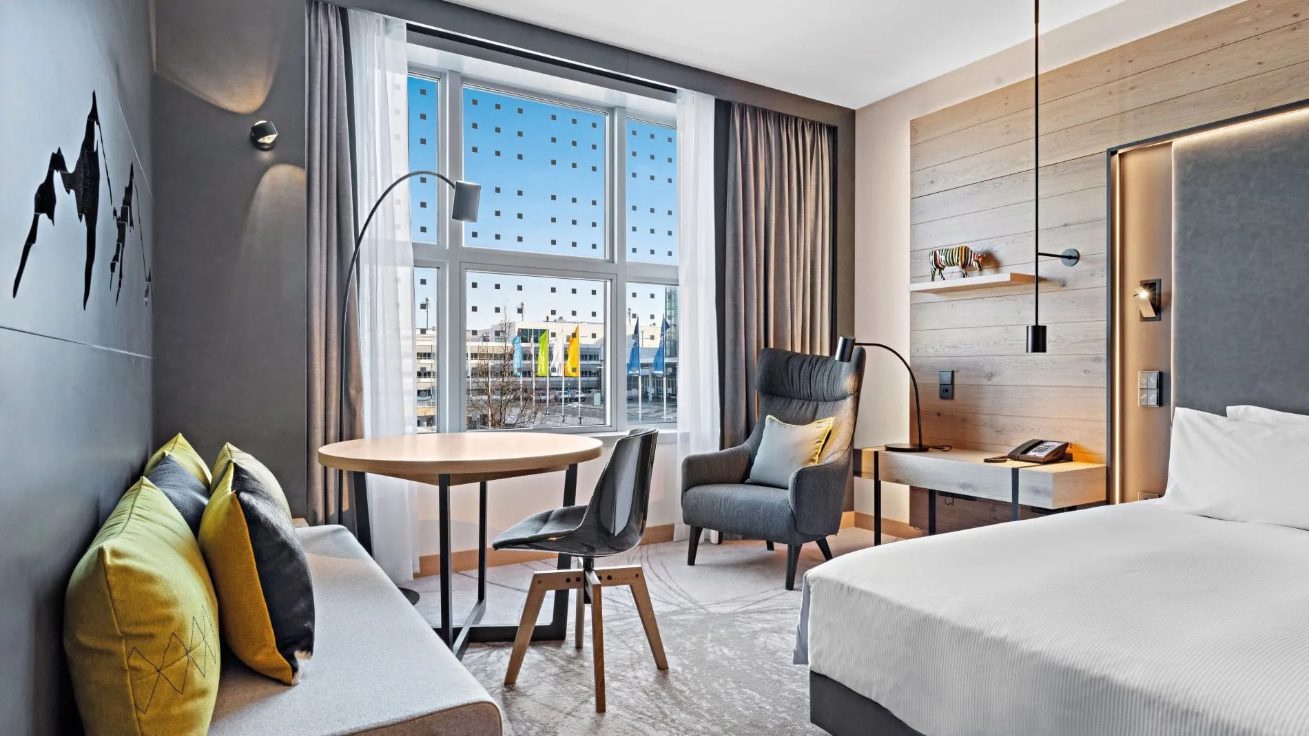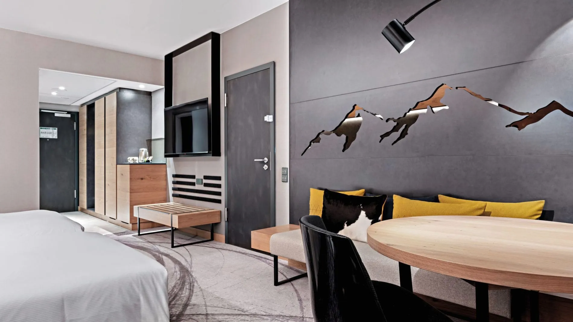 Bei der Modernisierung aller Zimmer und Suiten, sowie auch der Flure, kamen ausschließlich natürliche Materialien zum Einsatz: Bei der Fünfsterne-Ausstattung für die Bedürfnisse anspruchsvoller Reisender wurden Holz aus bayerischen Wäldern und Stoffe aus regionalen und lokalen Manufakturen verwendet. Die Farbgestaltung spiegelt dabei in den Zimmern wie auch in den öffentlichen Bereichen des Mountain Hub by Hilton Munich Airport die Natur der Voralpenregion wider – mit Naturtönen in Grün, Braun und Blau.