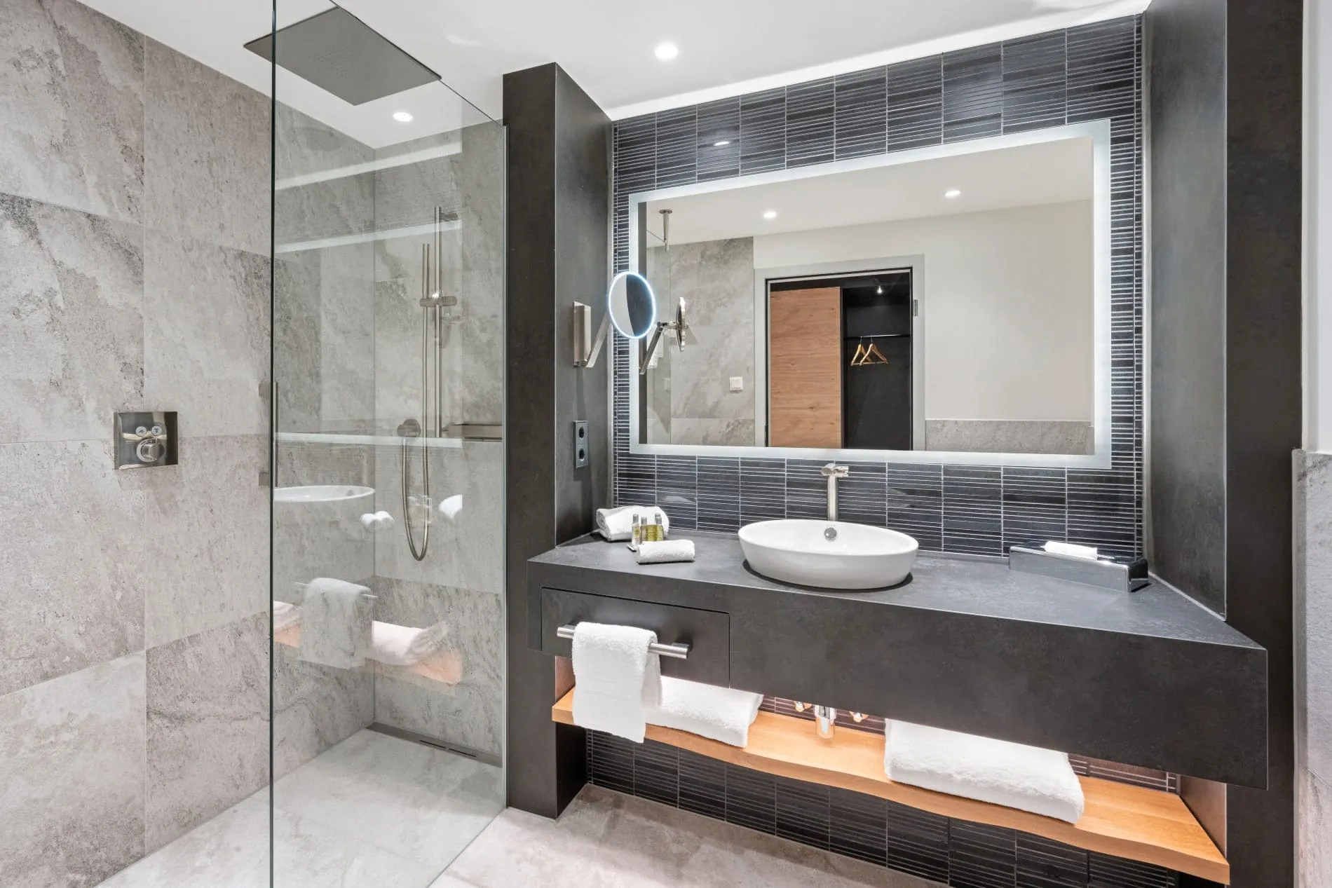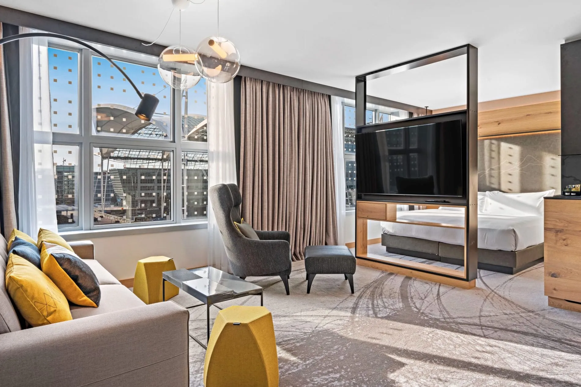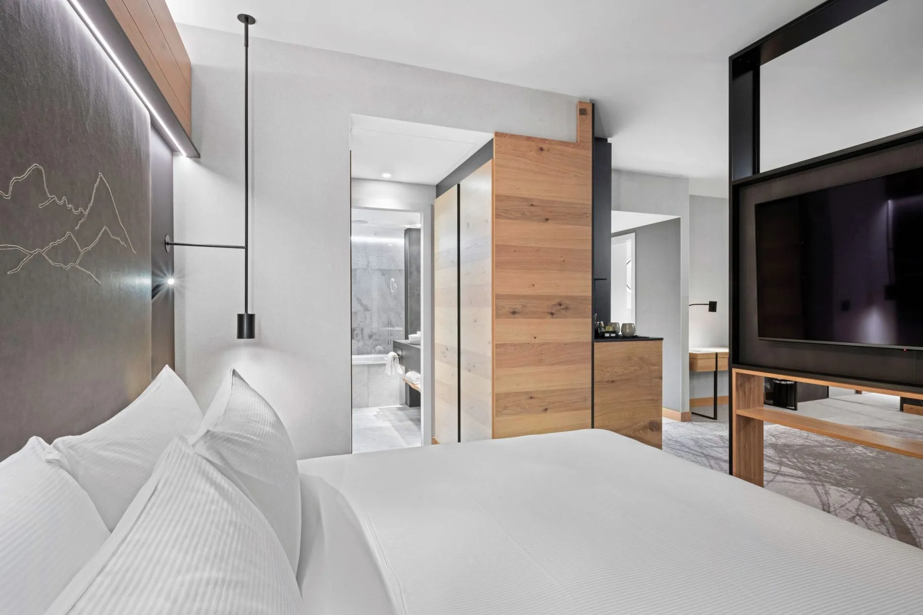 Bei der Modernisierung aller Zimmer und Suiten, sowie auch der Flure, kamen ausschließlich natürliche Materialien zum Einsatz: Bei der Fünfsterne-Ausstattung für die Bedürfnisse anspruchsvoller Reisender wurden Holz aus bayerischen Wäldern und Stoffe aus regionalen und lokalen Manufakturen verwendet. Die Farbgestaltung spiegelt dabei in den Zimmern wie auch in den öffentlichen Bereichen des Mountain Hub by Hilton Munich Airport die Natur der Voralpenregion wider – mit Naturtönen in Grün, Braun und Blau.