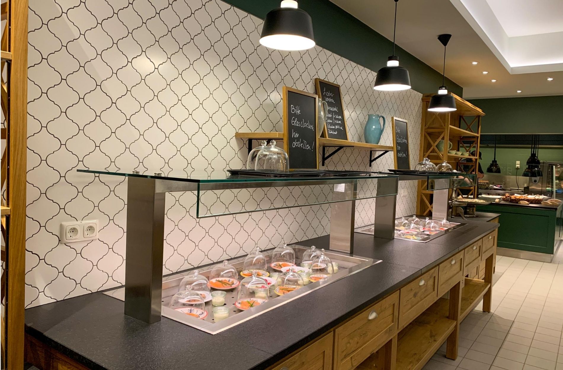 So werden an der Live-Dorfküchen-Station alle warmen Speisen wie verschiedene Eierspezialitäten, Speck, heiße Tomaten, Bohnen, kleine Würstchen oder auch Hash Browns frisch und individuell zubereitet. „All dies geschieht natürlich auf Abstand und sowohl unsere Mitarbeiter als auch die Gäste müssen dabei entsprechende Schutzmasken tragen“, sagt Karina Kull. Da das Selbstbedienungs-Buffet aus dem Seehotel Niedernberg komplett verbannt ist, gibt es die restlichen Frühstücksprodukte portioniert und arrangiert auf kleinen Tellern unter einer Glas-Glosche. Angenehmer Nebeneffekt: Es werden keine Teller mehr überladen – ein ökologischer Aspekt, dem das Team im Seehotel künftig verstärkt Rechnung tragen will.
