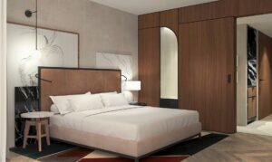 In den Zimmern tauchen nach Hotelangaben erneut die Moodboard-Elemente auf: Marmor hinter dem Kopfteil des Betts, aus dem Steinquader ist auf jeder Etage eine Skulptur geworden und der Bilderrahmen stellt ein unvollendetes Kunstwerk dar.