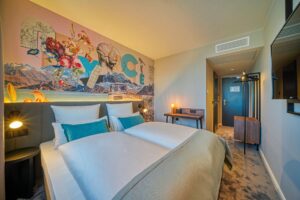 Das neue Ulmer Lifestylehotel steht auf dem ehemaligen Kässbohrer Areal in der Ulmer Weststadt. Das Vermächtnis des Industrie-Areals ist beim Interior vielfach aufgegriffen worden. So sind beispielsweise Tapeten, Kunst und Dekoration von den Kässbohrer Bussen inspiriert.