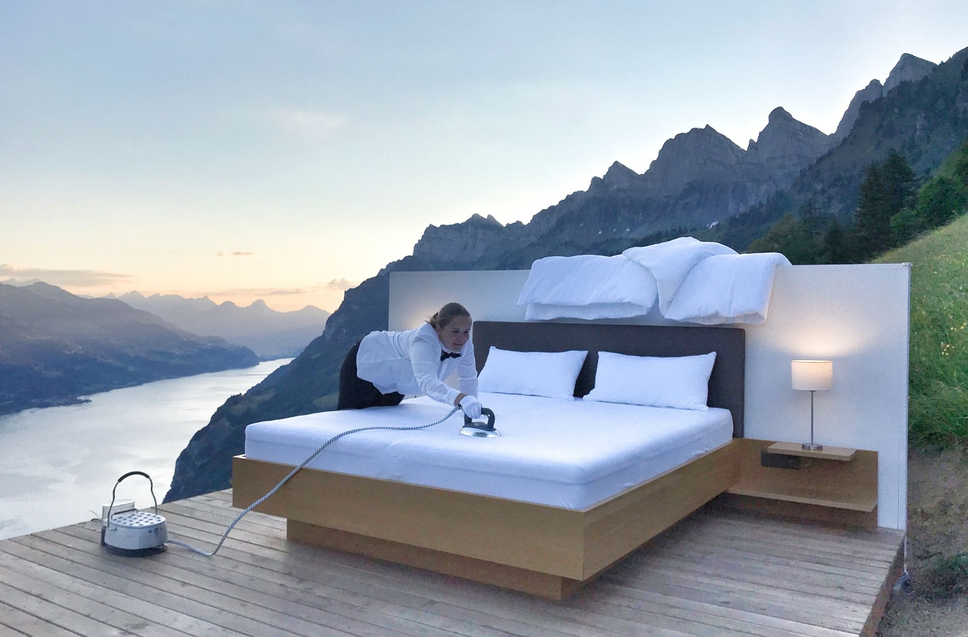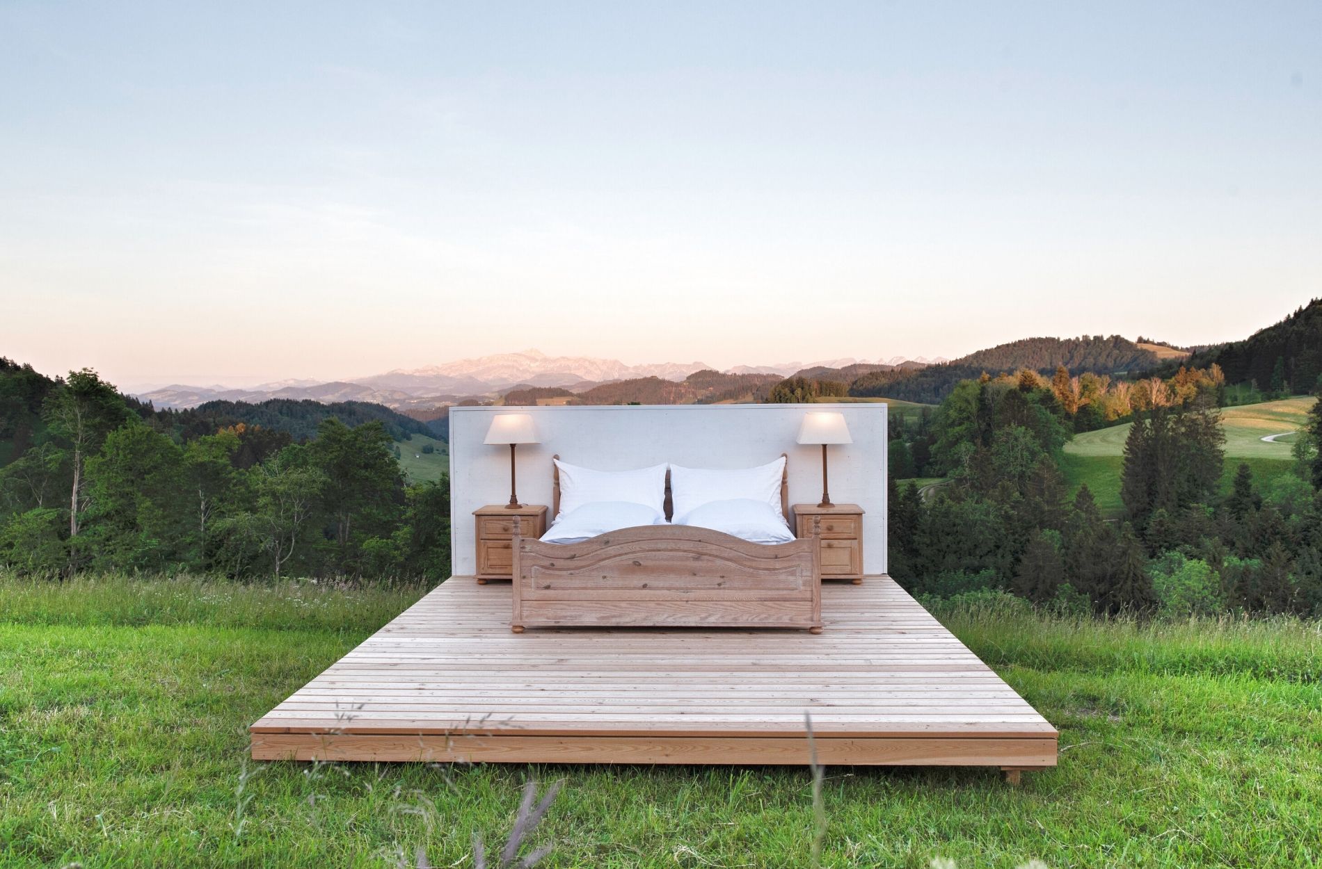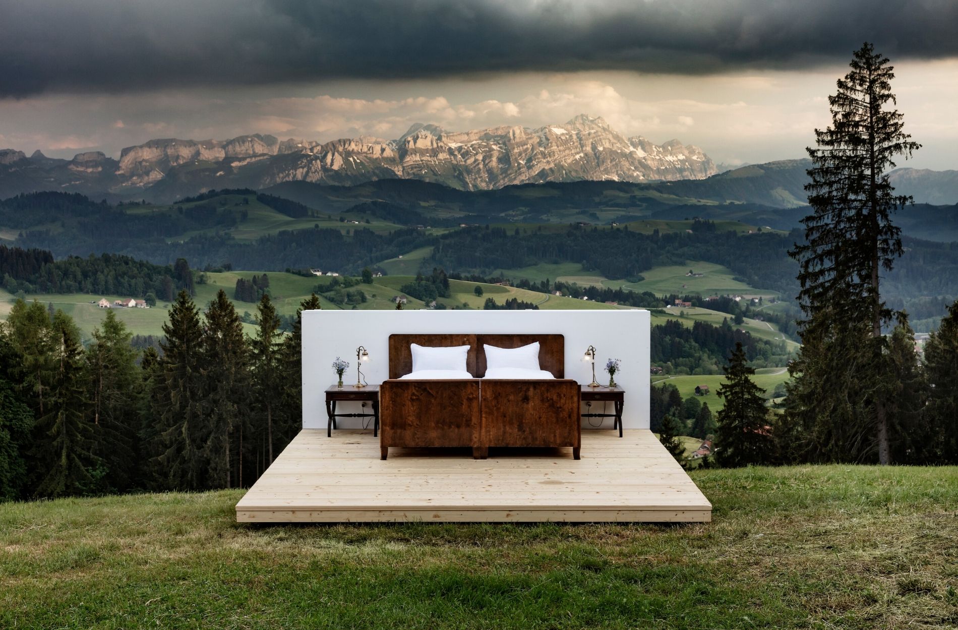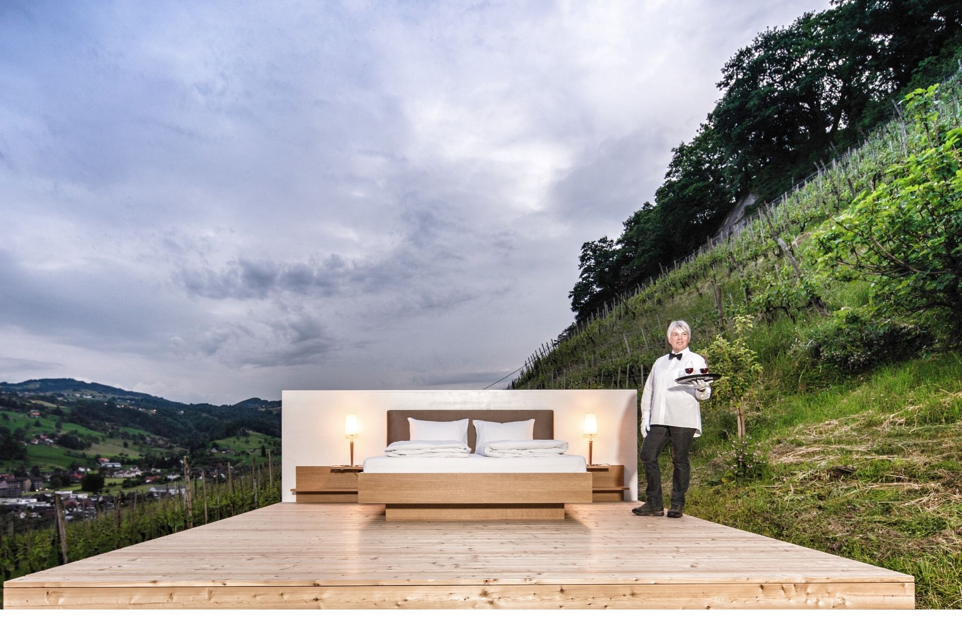 „Die Landschaft der Schweiz wird zur Tapete von Zimmern ohne Dach und Wände.“ Mit dieser Intention debütierten die Konzeptkünstler Frank und Patrik Riklin im Jahr 2016 mit dem „Null Stern Hotel“ in freier Natur. Im Graubündner Safiental konnten die Gäste damals erstmalig vor einer eindrucksvollen Kulisse und unter freiem Himmel im komfortablen Doppelbett nächtigen.