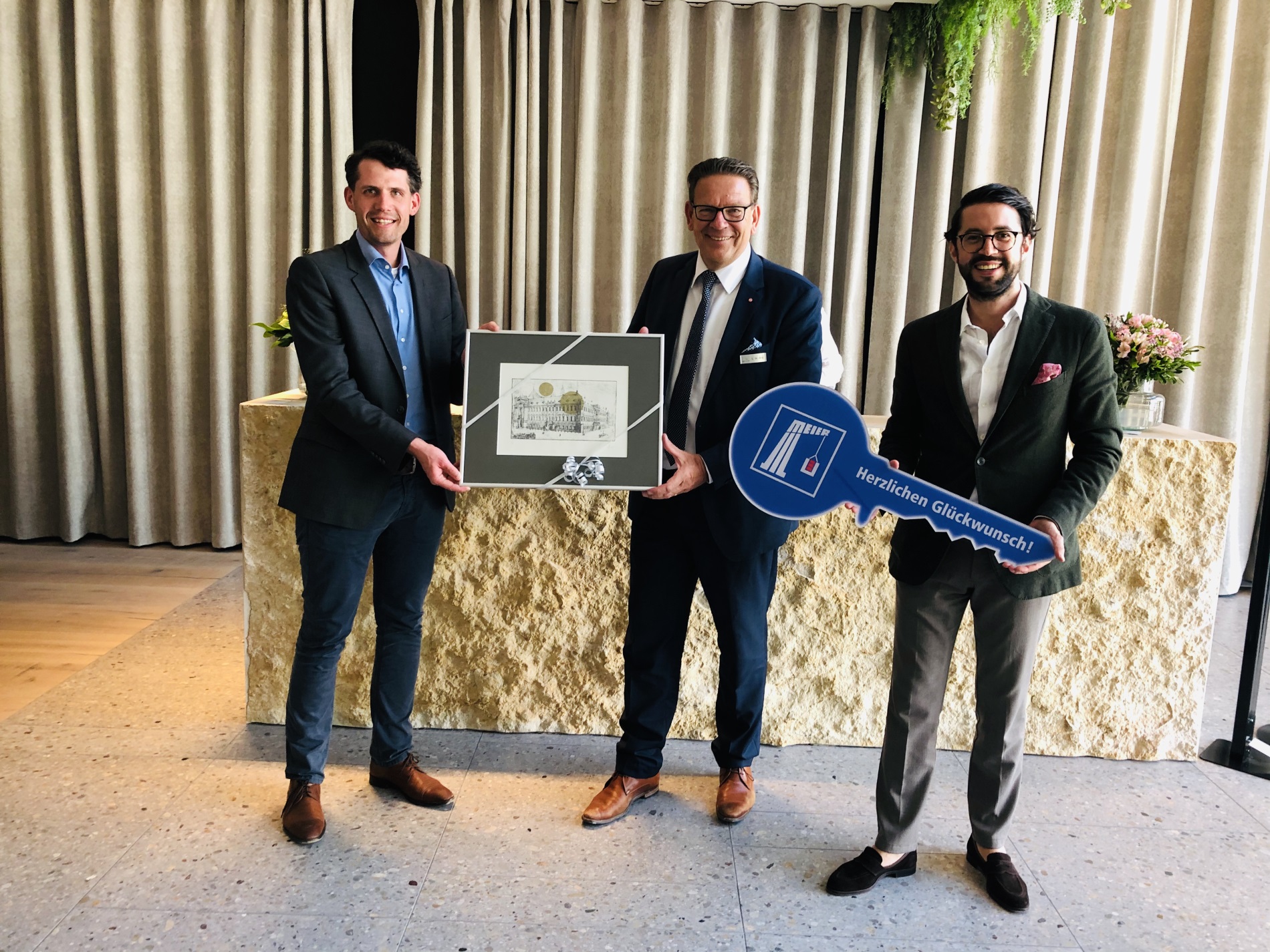 Schlüsselübergabe bei der Eröffnung des IBB Hotel Altmühltal-Eichstätt (von links): Eichstätts Oberbürgermeister Josef Grienberger, IBB Hotel Collection-Manager Lieuwe de Jong und als Vertreter für den Bauherrn Markus Meier, Geschäftsführer der Firmengruppe Meier aus Eichstätt. © IBB Hotel Collection