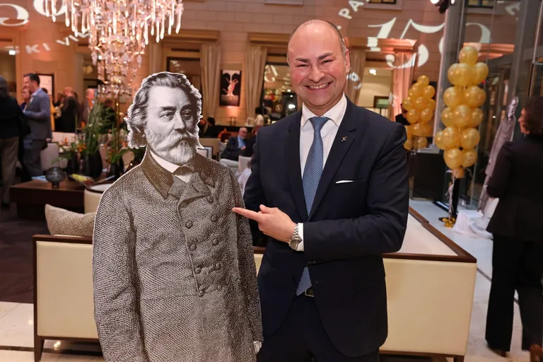 Gastgeber Florian Wille (Generaldirektor des Palais Hansen Kempinski) mit "Hauptprotagonisten" des Abends, Bauherr Theophil Hansen. - © Palais Hansen Kempinski Vienna / Foto: Katharina Schiffl