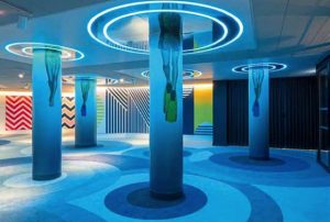 Nicht immer fällt die Orientierung durch die gestaffelten Ebenen leicht. Auf den Boden projizierte Bilder, Texte und Pfeile sorgen für Orientierung. Dabei helfen aber auch die im ganzen Haus verteilten Eyecatcher – seien es die mit Beinen und Taucherflossen bemalten Säulen oder die Tunnelbar der italienischen Designerin Teresa Sapey. Mit schwarzen, beleuchteten Bögen und orange-gelb-karierten Designersesseln soll sie – zwischen der Süßwasserquelle Roucas Blanc und dem Meer gelegen – den Übergang zwischen Schatten und Licht, Kühle und Wärme bilden.