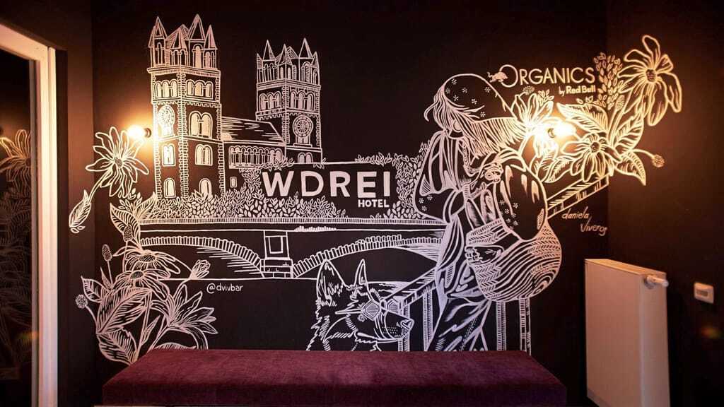 Entstanden sind Wandbilder, die unter anderem den Chinaturm, den Monopteros-Tempel im Englischen Garten, die Surflocation Eisbach oder Modezar Rudolph „Mosi“ Moshammer samt Yorkshire-Dame Daisy zeigen. Jedes Zimmer, buchbar ab 130 Euro, ist ein Einzelstück im Stil der jeweiligen Künstlerin. „Die Drei sind der Grund, warum unser Hotel so geworden ist, wie es jetzt ist“, sagt Faltenbacher. „Daher haben wir uns für den Namen WDrei für ‚Wir Drei‘ entschieden.“ Knapp sechs Wochen dauerte der Umbau, die Kosten beziffert Faltenbacher im niedrigen sechsstelligen Bereich. Was unverändert blieb, sind die Bäder, deren Böden jedoch gestrichen wurden. „Entstanden ist eine Unterkunft, in die ich selbst gern fahren würde“, sagt der New-York-Fan. Im Treppenhaus wurden zudem die Namen aller Projektunterstützer verewigt. „Bei meinen Projekten lebe ich stets die Maxime ‚Geben und Nehmen‘“, so Faltenbacher.