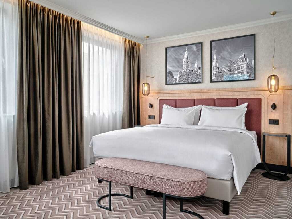 Die Gäste erwarten 120 Zimmer mit gedeckten Farbpaletten, hochwertigen Materialien und durchdachter Raumaufteilung. Einige Zimmer bieten Ausblick auf die Wiener Altstadt oder auf den Stephansdom. Neben kompakten Business-Zimmern stehen auch Suiten mit privaten Terrassen zur Verfügung.