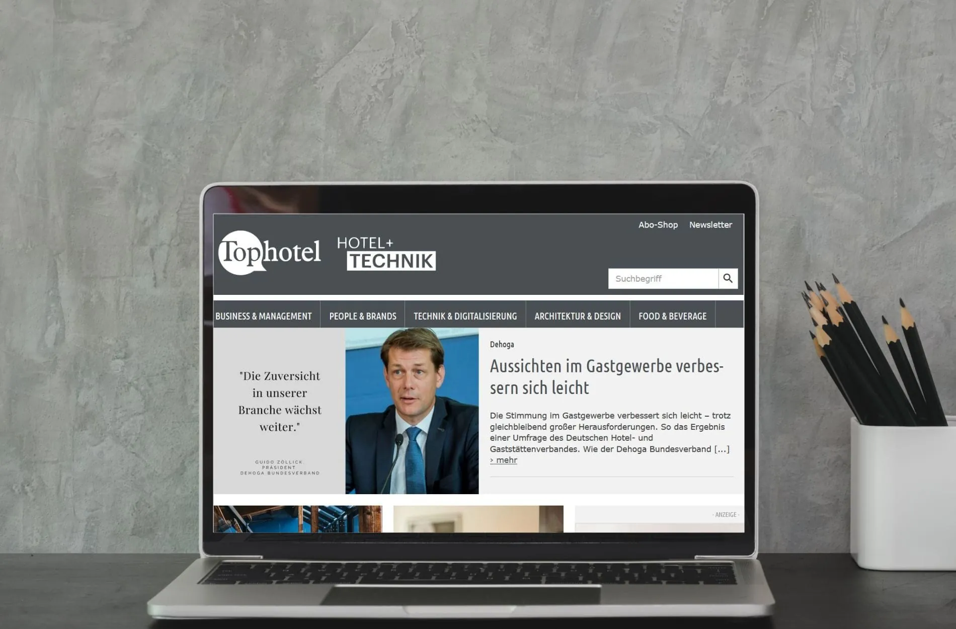 Branchennews sind der Kern unseres Onlineangebots. Sie werden auf der neugestalteten Homepage noch übersichtlicher präsentiert. Das neue Hauptmenü ist in die Kategorien Business & Management, People & Brands, Technik & Digitalisierung, Architektur & Design sowie Food & Beverage untergliedert. Damit haben Nutzer und Nutzerinnen auf einen Blick beziehungsweise Klick schnellen Zugang zu allen wichtigen Themen der Branche.