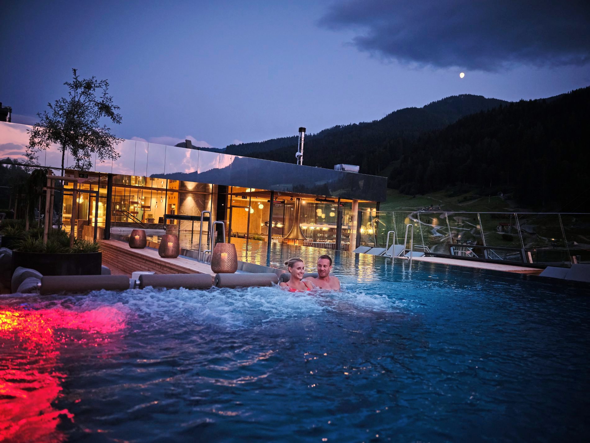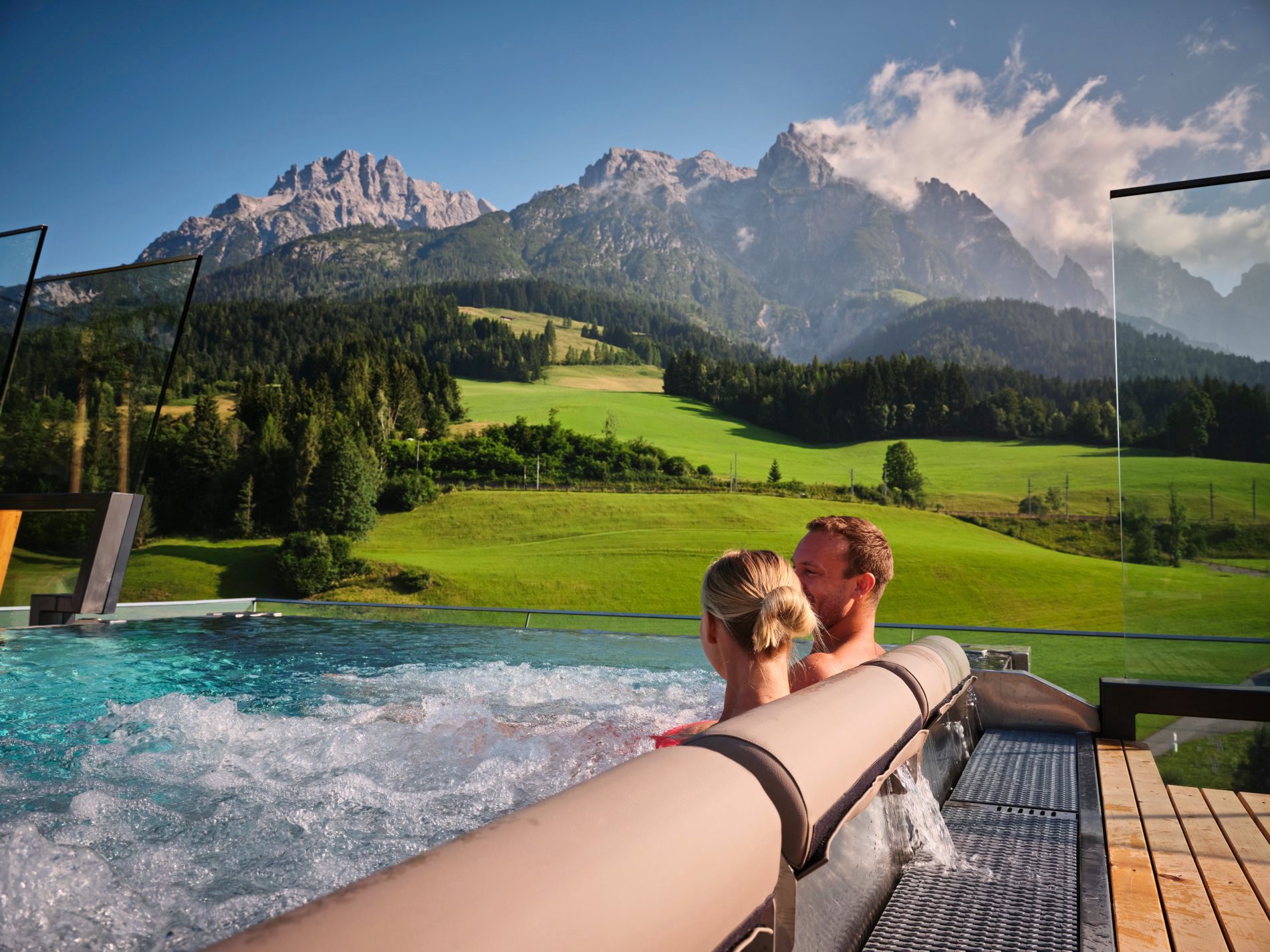 Seit März dieses Jahres wurde der Salzburger Hof Leogang einem Makeover unterzogen. Ab sofort ergänzt ein 1.200 Quadratmeter großer Wellnessbereich mit vier Panoramasaunen und einem Infinity-Sky-Pool das Angebot des Hotels. Der neu geschaffene Bereich erstreckt sich über zwei Stockwerke und wurde auf das Bestandsgebäude aufgesetzt.