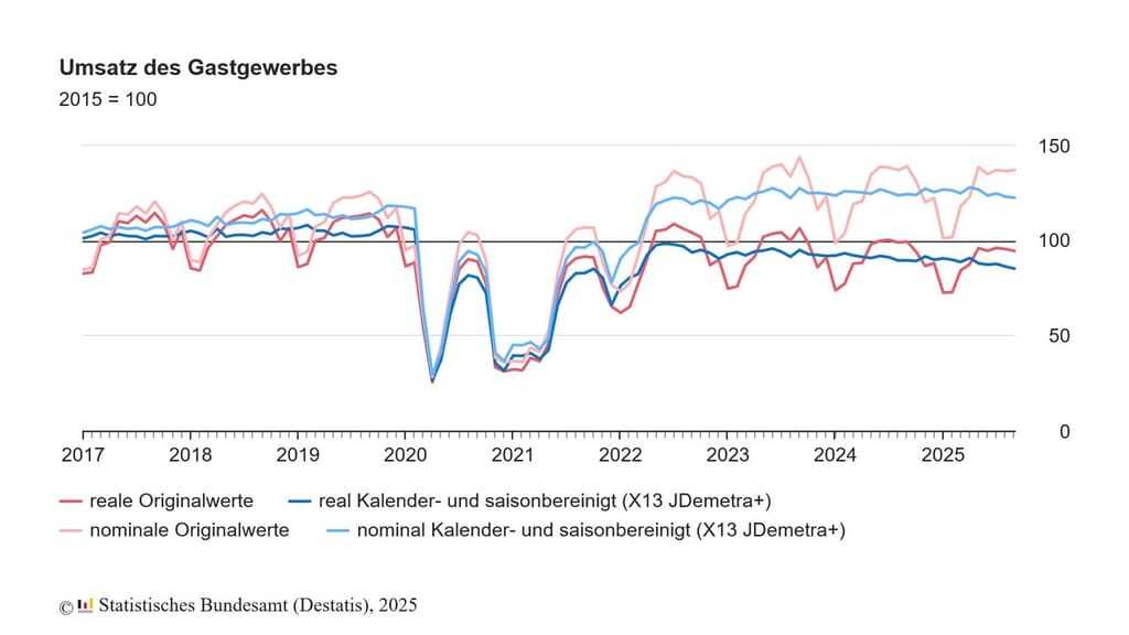 Das Gastgewerbe in Deutschland hat im September 2025 nach vorläufigen Ergebnissen des Statistischen Bundesamtes (Destatis) rückläufige Umsätze verzeichnet. Kalender- und saisonbereinigt sanken die Einnahmen real um 1,3 Prozent und nominal um 0,4 Prozent im Vergleich zum August 2025. Im Jahresvergleich fällt das Minus noch deutlicher aus: Gegenüber September 2024 lag der Umsatz real 4,9 Prozent und nominal 1,4 Prozent niedriger.