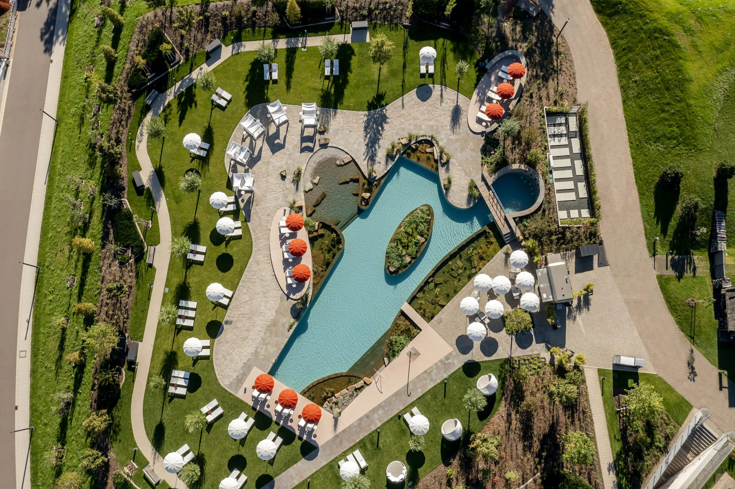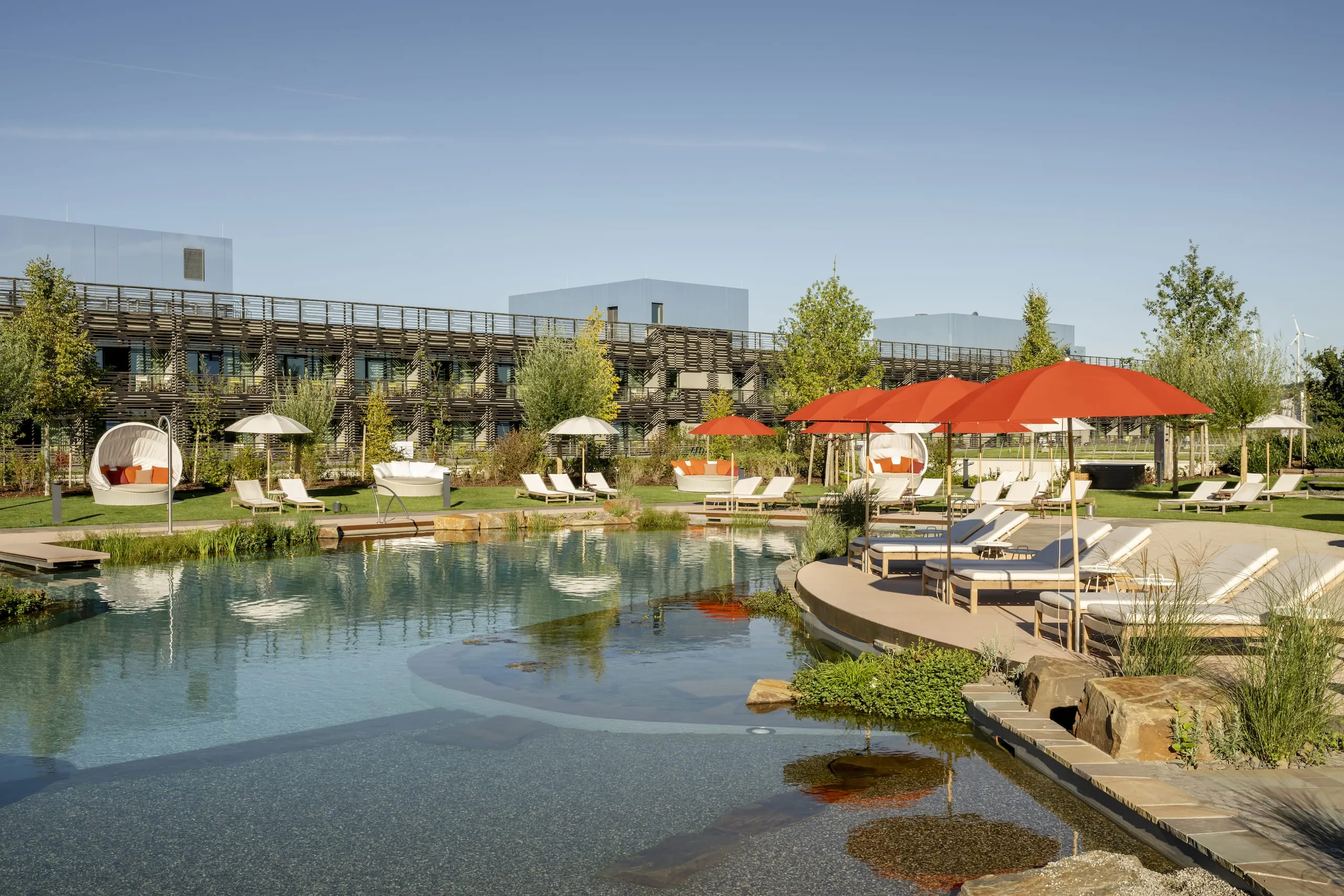 Bei der Ausgestaltung des Badeteichs und der Gartenanlage standen für die Hotelbetreiber regionale Pflanzen und Materialien im Vordergrund – darunter Kopfweiden, Vogelkirschen, Stieleichen und Hainbuchen sowie einheimische Natursteine. Wichtig waren – neben der großen Wasserfläche – auch ein Rückzugsbereich für die Gäste, der mit etwa 30 Ruheplätzen rund um den Teich realisiert wurde. „Wir haben nun ein lebendiges Ambiente zur Verfügung, das sich für entspannte Stunden genauso gut eignet wie für Sundowner mit Livemusik. Das kristallklare Wasser unterstreicht den starken Wellness-Charakter, wobei die hellgraue Folie den Teich wie einen Bergsee strahlen lässt“, so Sersch.