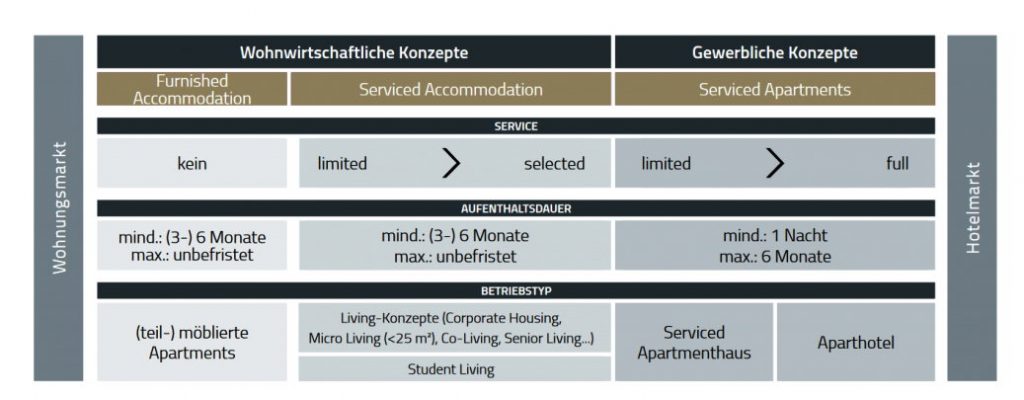 Neu ist die striktere Trennung zwischen wohnwirtschaftlichen und gewerblichen Konzepten. So werden Serviced Apartments zum ersten Mal ausschließlich dem gewerblichen Bereich zugeordnet. Die Einordnung von Konzepten und Betriebstypen erfolgt dabei über den Service-Grad, die Aufenthaltsdauer und die Betriebsform, nicht mehr über die Apartmentgrößen.