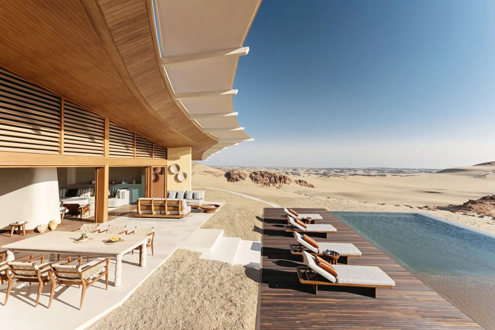 Das Six Senses Southern Dunes, The Red Sea, geht bereits im November dieses Jahres an den Start. Das Herzstück des Resorts bildet „The Oasis“. Hier befinden sich Rezeption, Lobby, eine Boutique, Tagungs- und Gebetsräume, eine Gemeinschaftslounge und das Earth Lab. Das von einer Wüstenblume inspirierte Vordach spendet Schatten. Um The Oasis herum liegen die Zimmer mit offenem Schlaf- und Wohnbereich und einer Außenterrassen. Insgesamt umfasst das Resort 36 Gästezimmer und Suiten sowie 40 Poolvillen. Die Inneneinrichtung greift Akzente, Töne und Texturen der Wüste auf. Die Hotelvillen sind auf verschiedene Hügel verteilt. Für eine einzigartige Kulisse sorgen gewellte Dächer, die von der Form einer Düne inspiriert sind. Das zugehörige Six Senses Spa wartet mit Anti-Aging-Zentrum, einer Spa-Suite, Behandlungsräumen und einer Poolbar auf.