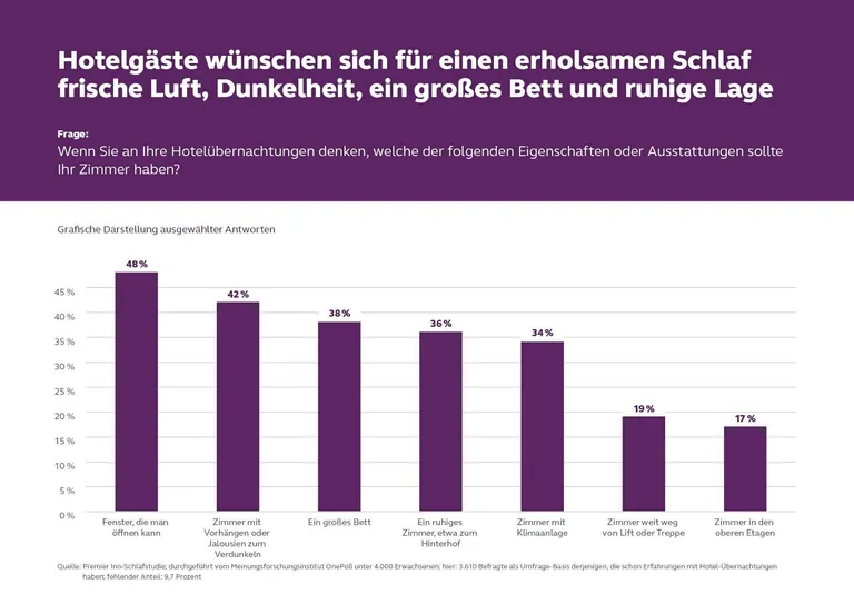 Unterschiede gebe es dabei zwischen den Geschlechtern. Frauen wünschen sich deutlich häufiger zu öffnende Fenster (58 % zu 39 % bei Männern), eine Möglichkeit zur Verdunkelung (50 % zu 33 %) oder ruhigere Hinterhoflagen (40 % zu 31 %). Männer gehen vor dem Zubettgehen dagegen häufiger an die Bar (17 % zu 13 %) als Frauen.