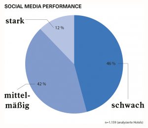 Die Basis zur Beantwortung dieser Frage liefert das komplexe Punktesystem des Hotel Digital Scores, das eine Reihe verschiedener Parameter analysiert und gewichtet. Beispielsweise erhält ein Hotel eine umso stärkere Bewertung im Bereich Social Media, je mehr einzelne Parameter wie Präsenz auf Facebook oder Instagram, Posting-Frequenz und Anzahl der Follower mit positivem Resultat analysiert wurden. Ergebnis: Nur zwölf Prozent der analysierten Hotels wurden hierbei mit "stark" bewertet, während 42 Prozent als "mittelmäßig" und 46 Prozent als "schwach" eingestuft wurden. Auch hier zeigt sich deutlich, dass Hotels mit einer höheren Sterneklassifizierung im Durchschnitt besser abgeschnitten haben als Hotels mit weniger Sternen.