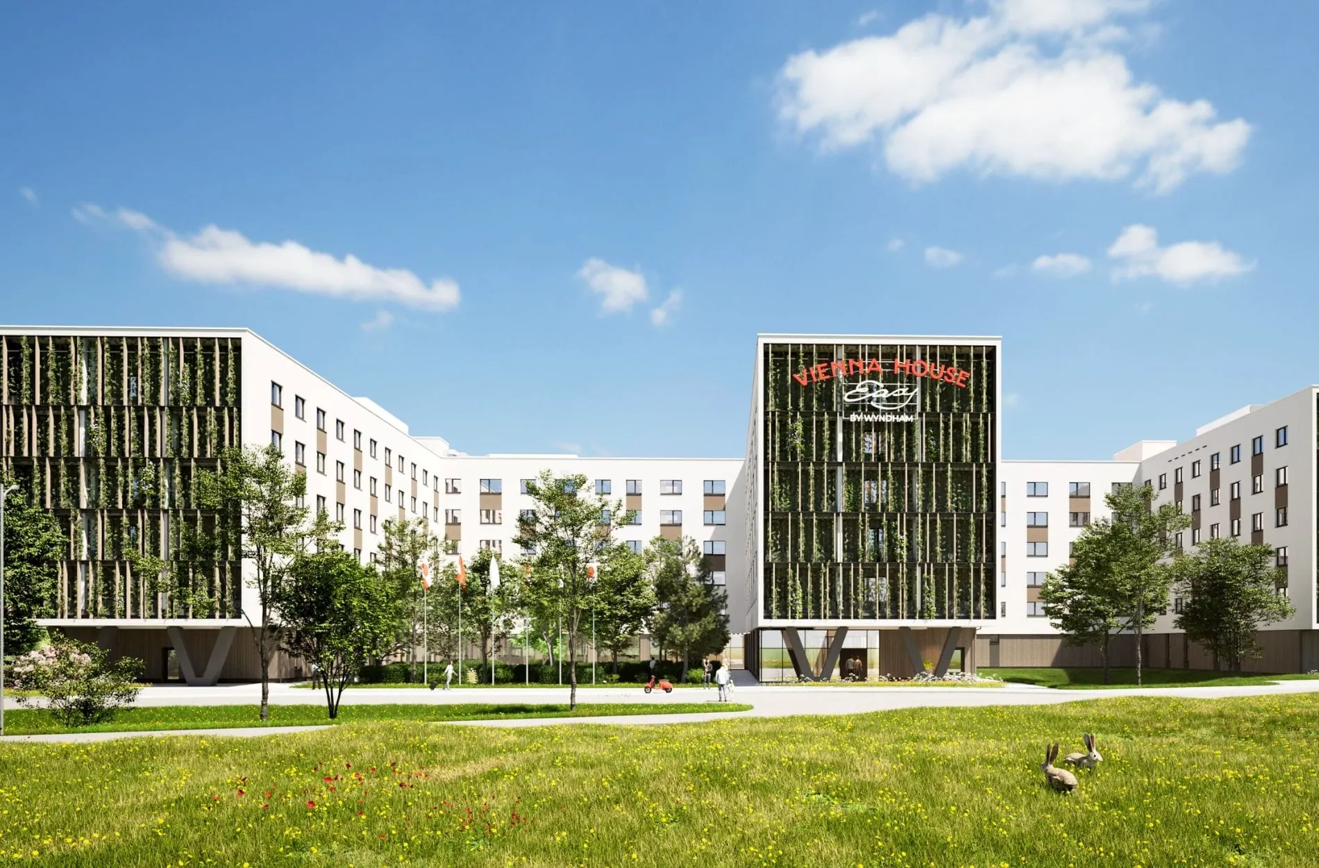 Der Wiener Immobilienentwickler Mamma Group errichtet am Flughafen Wien ein Hotel mit 510 Zimmern, das unter der Marke Vienna House Easy by Wyndham von der Berliner HR Group geführt wird. Damit erhöht sich die Hotelkapazität am Wiener Airport auf künftig mehr als 1.400 Zimmer. Beim Bau steht Nachhaltigkeit im Fokus. So wird das Gebäude das europaweit größte Hotel in Holzbauweise sein. Die Eröffnung ist für Ende 2025 geplant.