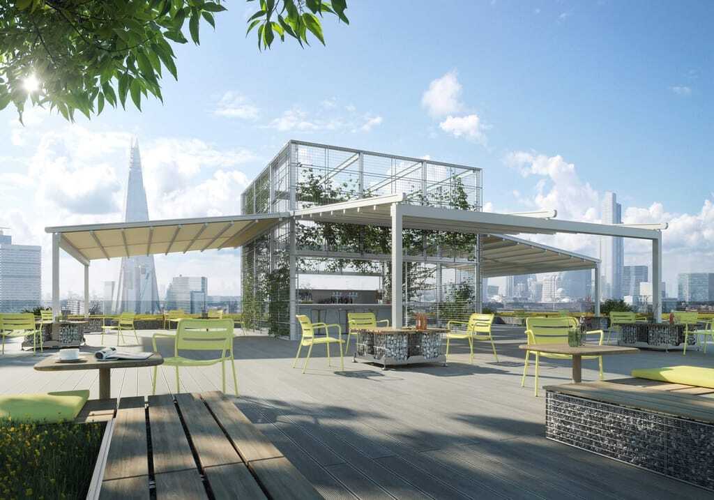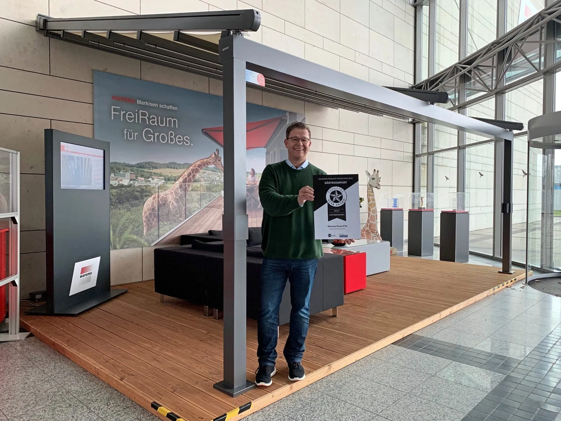 Bei der Markise „Perea P70“ kamen laut Warema eine innovative Falttechnik sowie transluzente Stoffe zum Einsatz. Sie biete durch ihren maximalen Wind- und Wetterschutz Planungssicherheit für Events im Außenbereich. Die an den Querprofilen angebrachte dimmbare LED-Sitzplatzbeleuchtung sorgt für angenehmes Ambiente. Die Pfostenbefestigung kann mittels Multicube Gabione erfolgen, somit entfällt das Anlegen von Betonfundamenten. Daher ist auch die Installation auf einer Dachterrasse problemlos möglich, und es entstehen zusätzliche Sitzgelegenheiten.