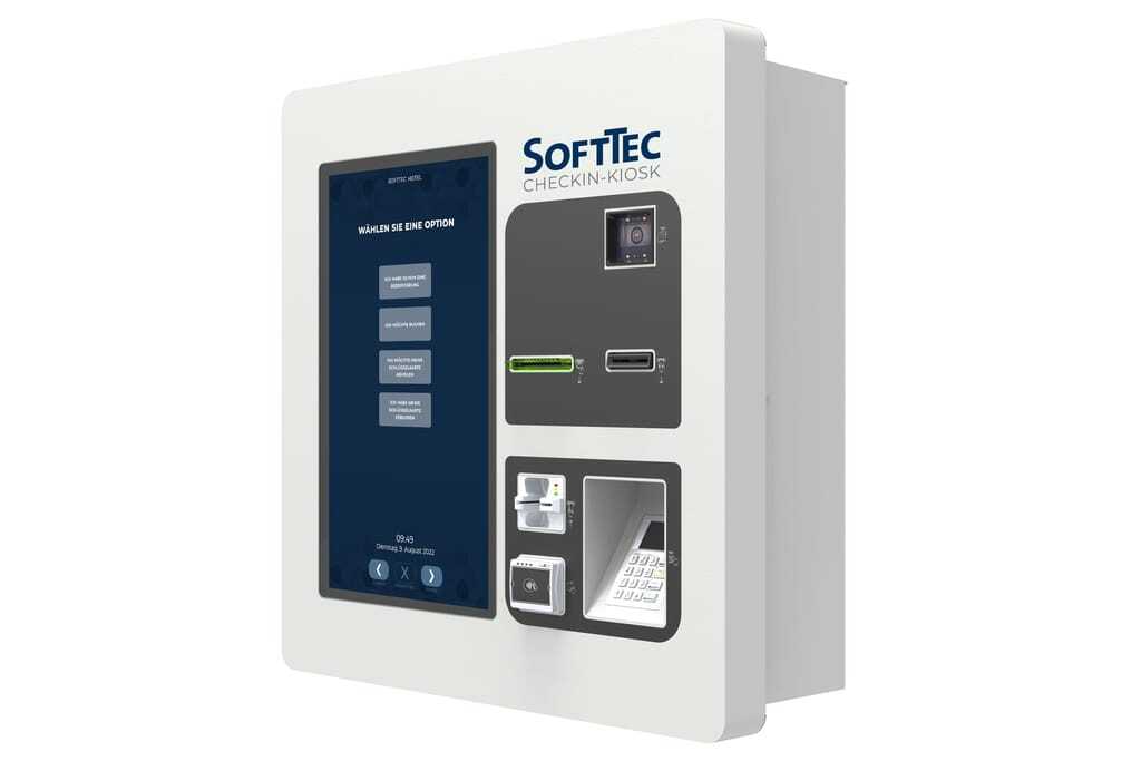 Mit dem „Checkin-Kiosk“ von Softtec können Gäste, im Hotel sowie draußen vor der Tür, kontaktlos rund um die Uhr einchecken. Das spart Hotels jeder Größe und Art nicht nur Aufwand und Personaleinsatz, sondern bietet auch den Gästen mehr Flexibilität, da sie sich nicht nach Öffnungszeiten richten müssen. Komplette Check-in-Prozesse werden vom Gast selbst abgewickelt. Buchungsdaten werden abgerufen und Schlüsselkarten erstellt. Mit dem Kartenlesegerät können offene Rechnungen gesplittet oder noch vor Ort bezahlt oder automatisch verschickt werden. Dank der Zwei-Wege-Synchronisation kommuniziert das Self-Check-in-Terminal mit der Hotelsoftware und vermeidet dadurch Fehlerquellen und manuelle Arbeitsschritte.