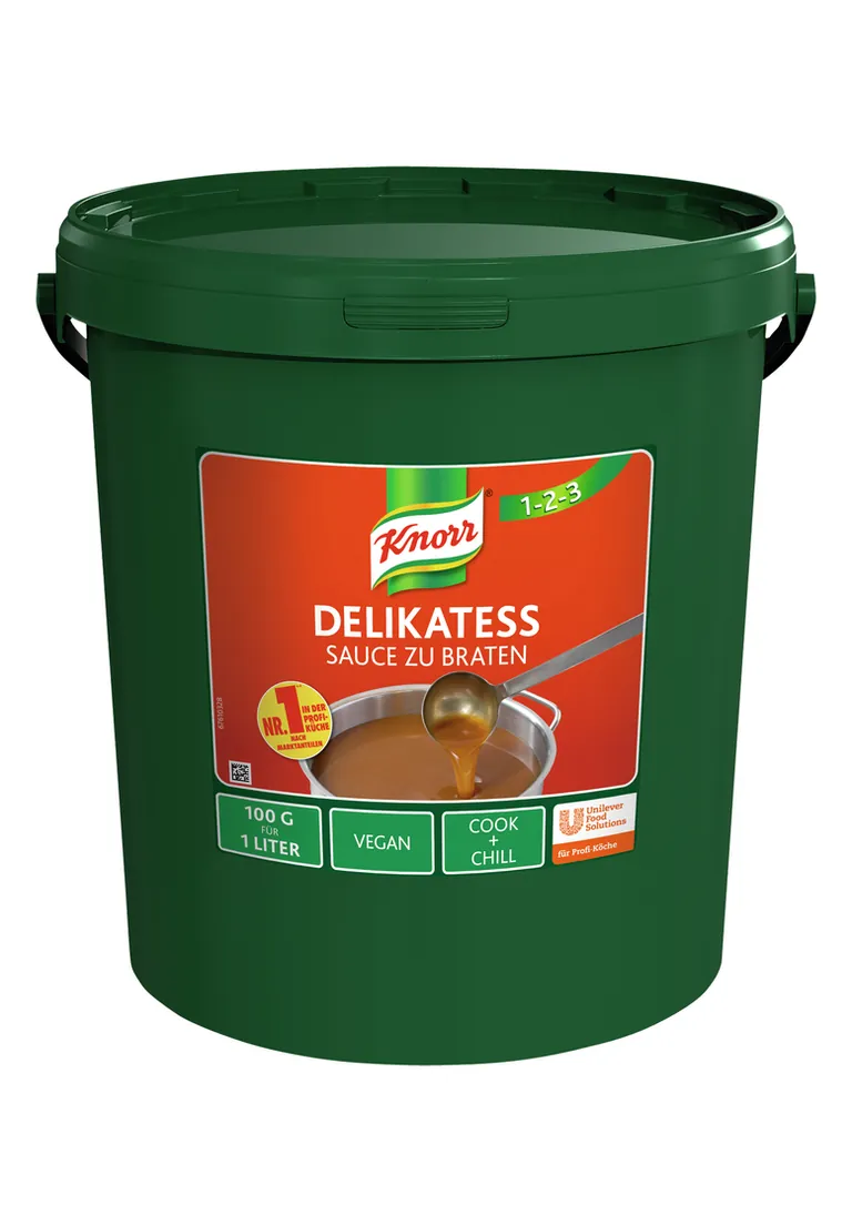 Die „Delikatess Sauce zu Braten“ ist eine vegane Saucenbasis von Knorr Professional. Sie eignet sich laut Hersteller für pflanzenbasierte und fleischhaltige Gerichte gleichermaßen. Im Vergleich zu einer frisch gekochten braunen Sauce sorge sie für eine Zeitersparnis von bis zu 85 Minuten, so sei innerhalb von nur fünf Minuten die Saucenbasis zubereitet. Das vereinfache Prozesse deutlich, sodass neues und ungelerntes Personal in Zeiten des Fachkräftemangels leicht eingearbeitet werden könne. Das gehe jedoch nicht auf Kosten von Geschmack und Vielfalt – mit nur wenigen Handgriffen lassen sich vielfältige Saucenvarianten mit der „Delikatess Sauce zu Braten“ zubereiten.